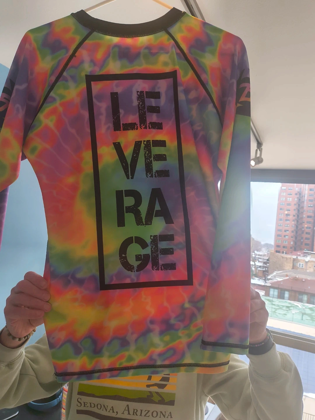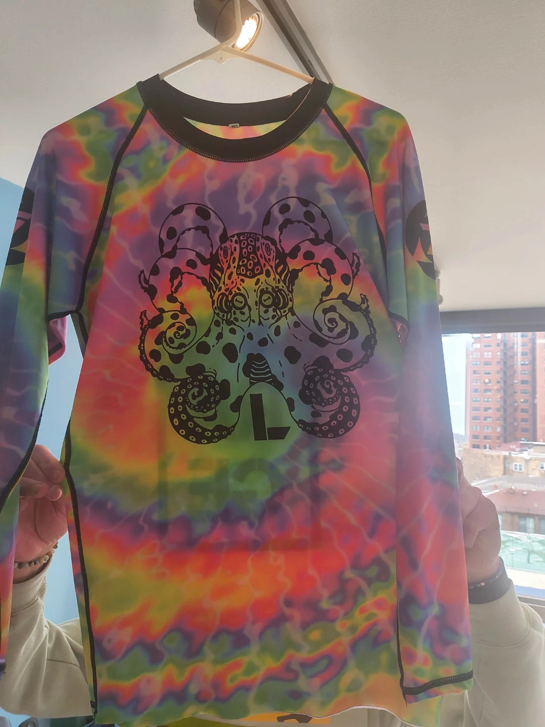 This long sleeve shirt features a vibrant tie-dye pattern with a large octopus graphic on the front and 'Leverage' text on the back. It's a unique piece for any wardrobe. Material appears to be polyester blend.