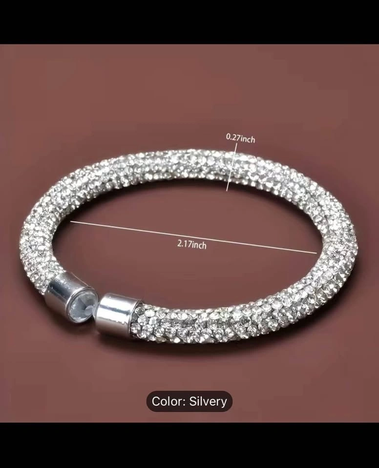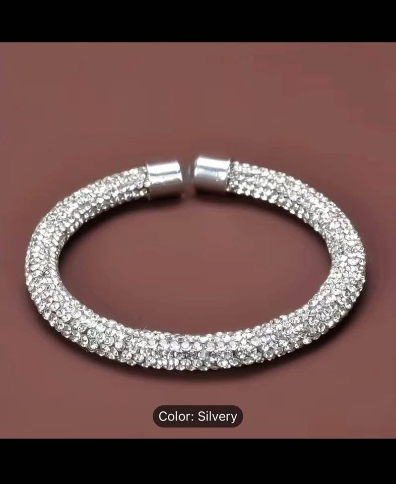 Add a touch of elegance to your hand with this beautiful beaded bangle bracelet. Made of silver-plated metal, this bracelet is adorned with shimmering rhinestones that sparkle in the light. The bracelet's silver color complements the rhinestones perfectly, making it a perfect accessory for any occasion. This bracelet is perfect for those who love fashion jewelry. It's a great addition to any collection and can be worn with any outfit. The bangle design makes it easy to slip on and off, and it's comfortable to wear all day. Make a statement with this beautiful bracelet that will surely catch everyone's attention.