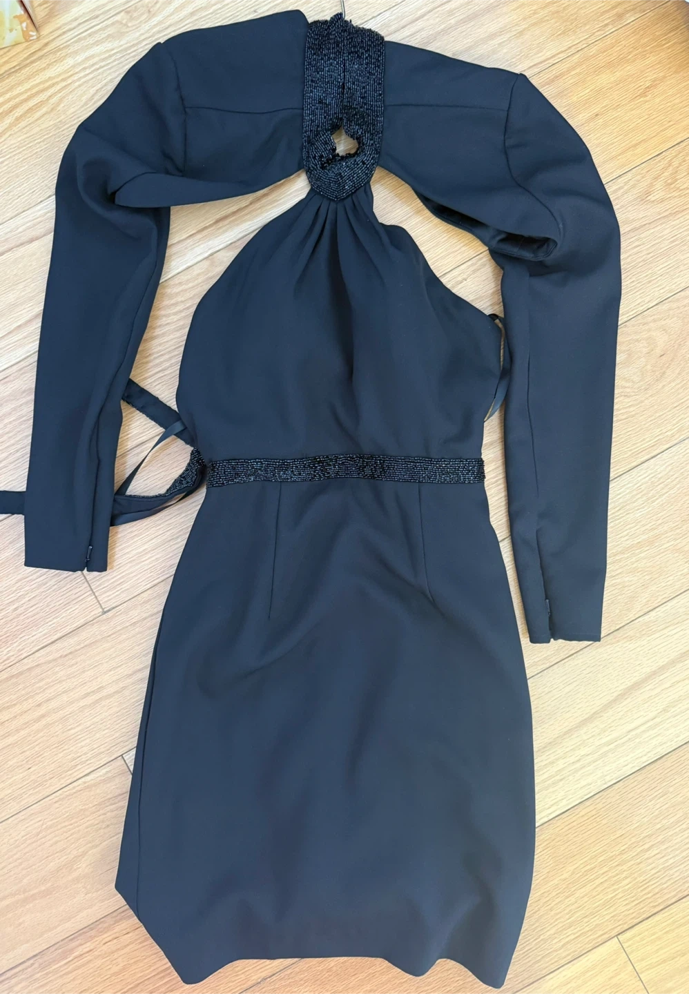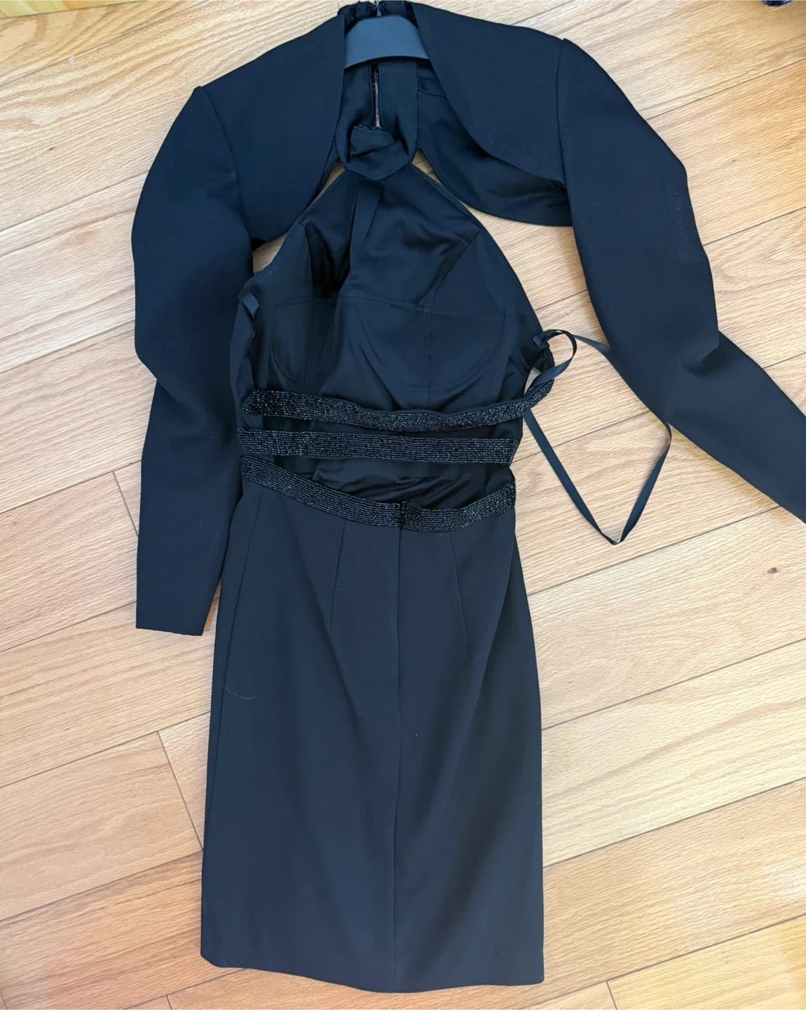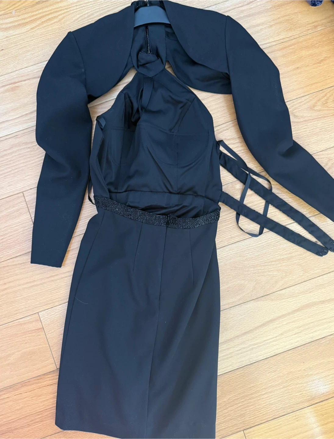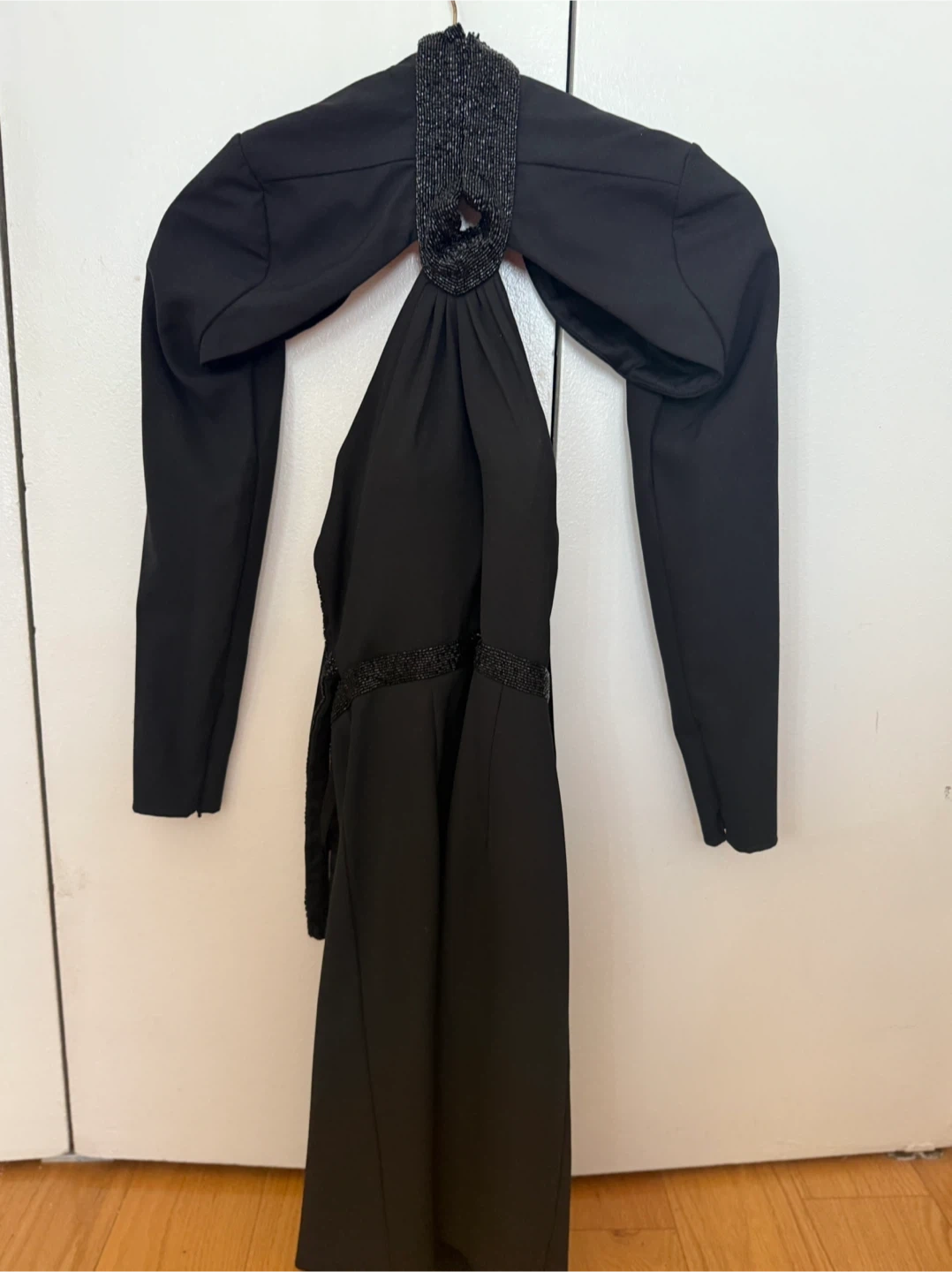 This elegant black halterneck dress comes with a matching bolero jacket. It features beaded detailing along the waist and neckline. Perfect for formal events!