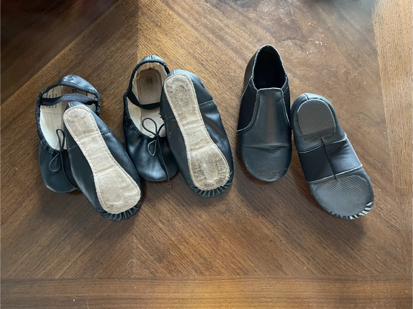Free ballet shoes in size 11 and a pair of jazz shoes in size 12. Both are black and show signs of wear on the soles, but are still in good condition for practice or classes. Take all 3 pairs and grow into them!