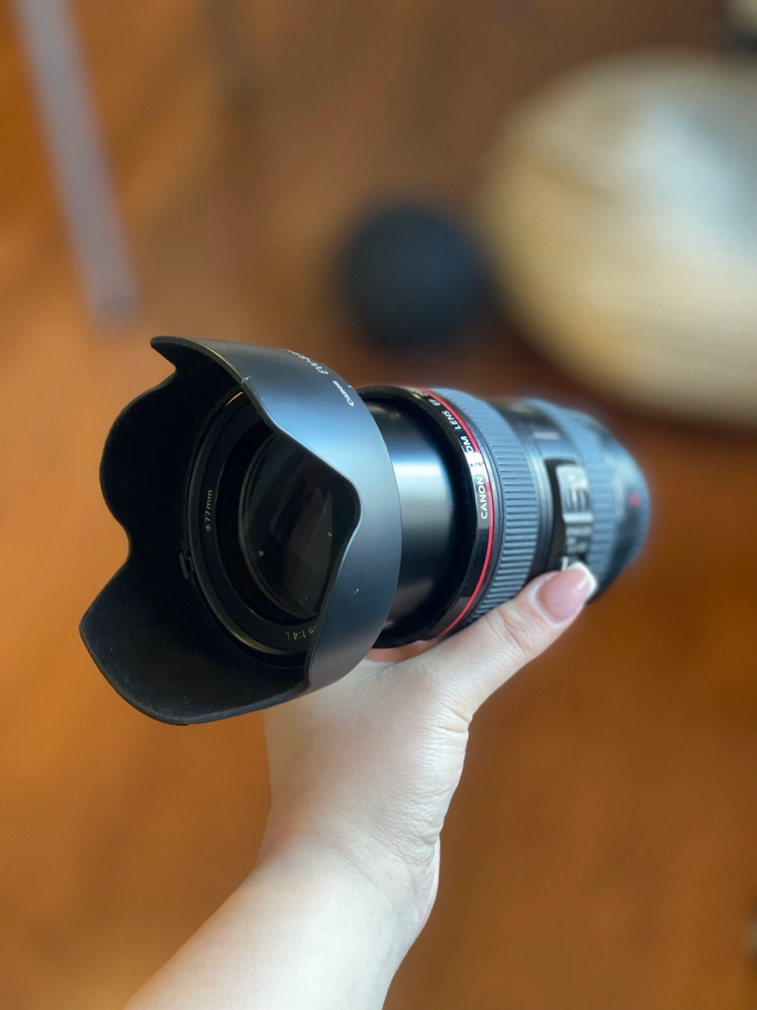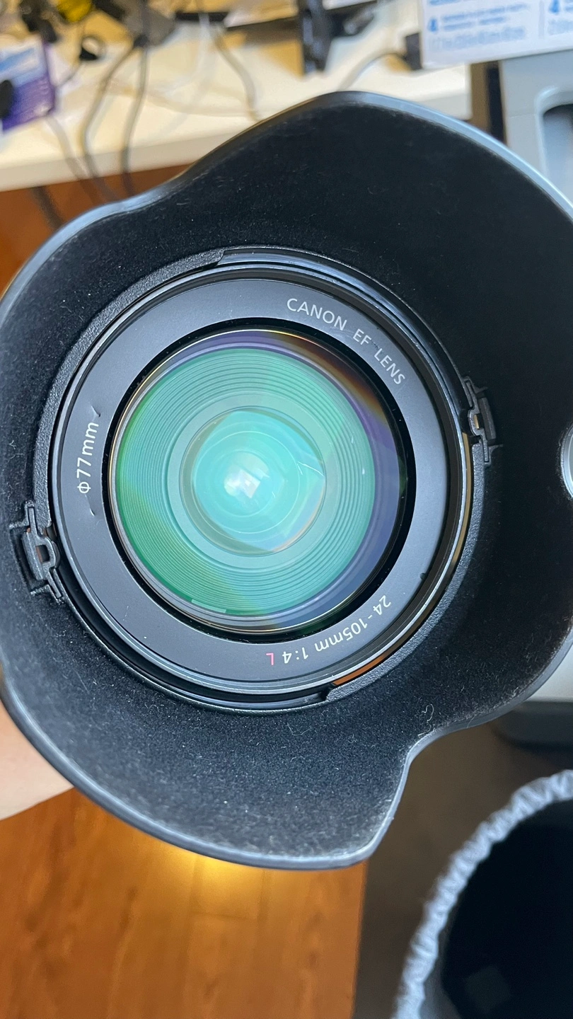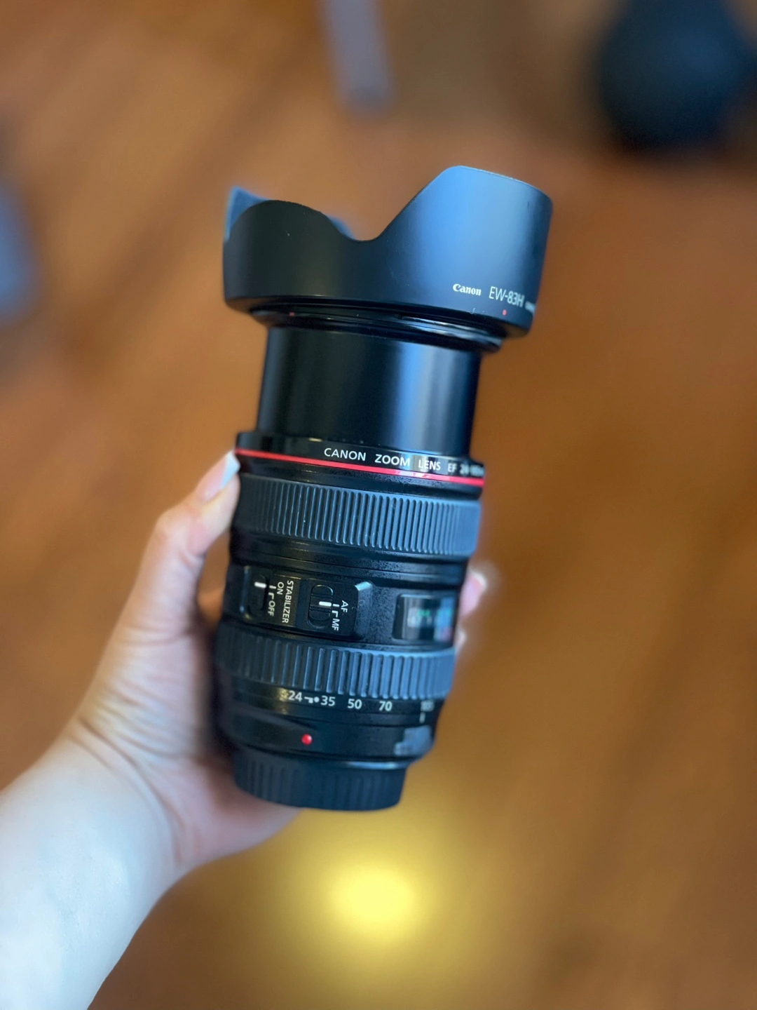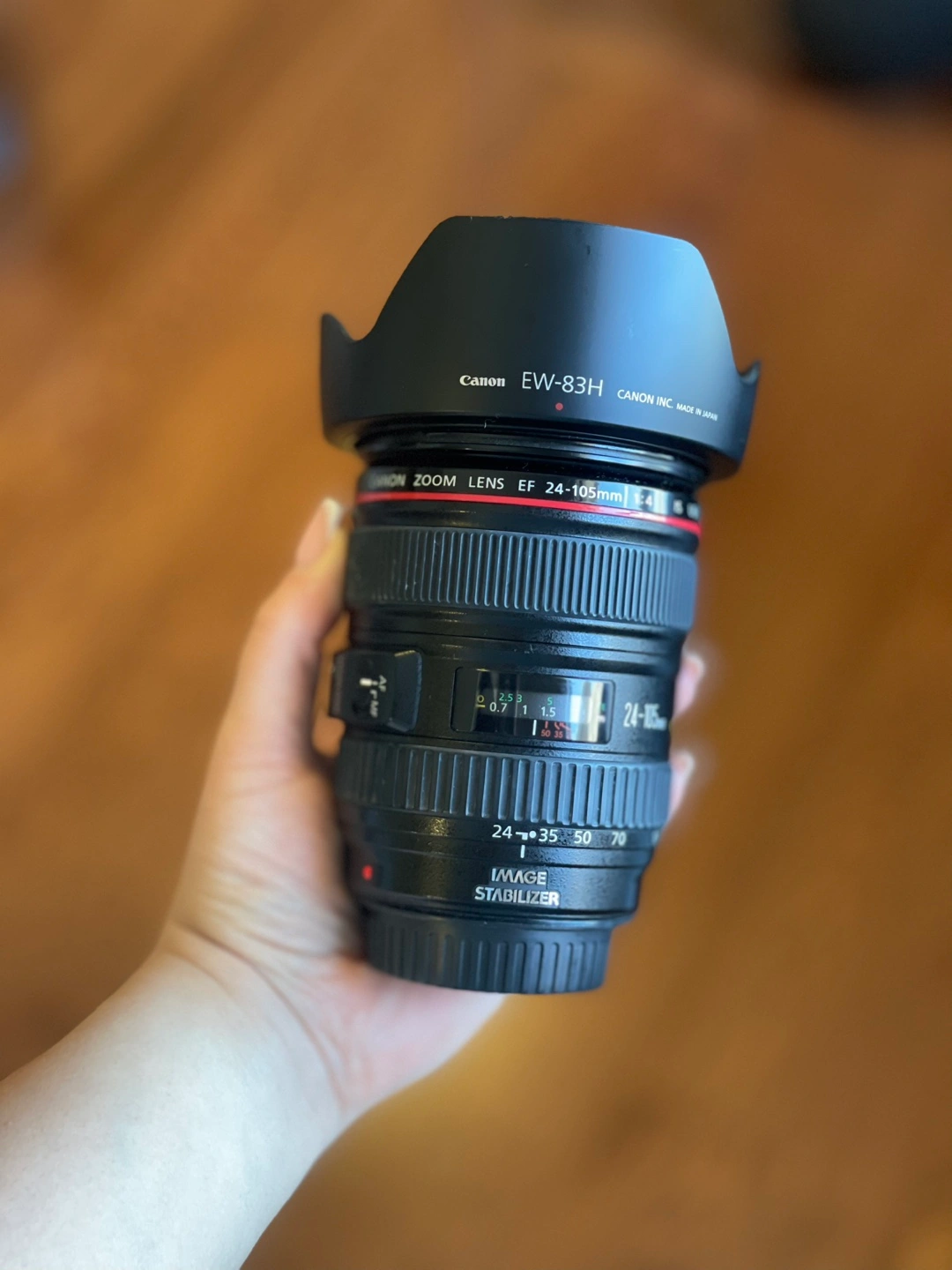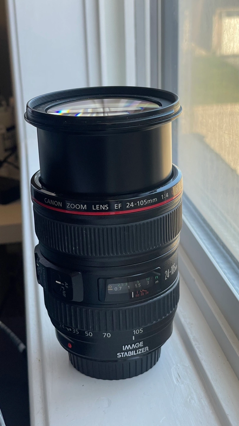 Canon 24-105mm f4L IS USM zoom lens. Image stabilizer. Includes lens hood. Great for everyday photography.