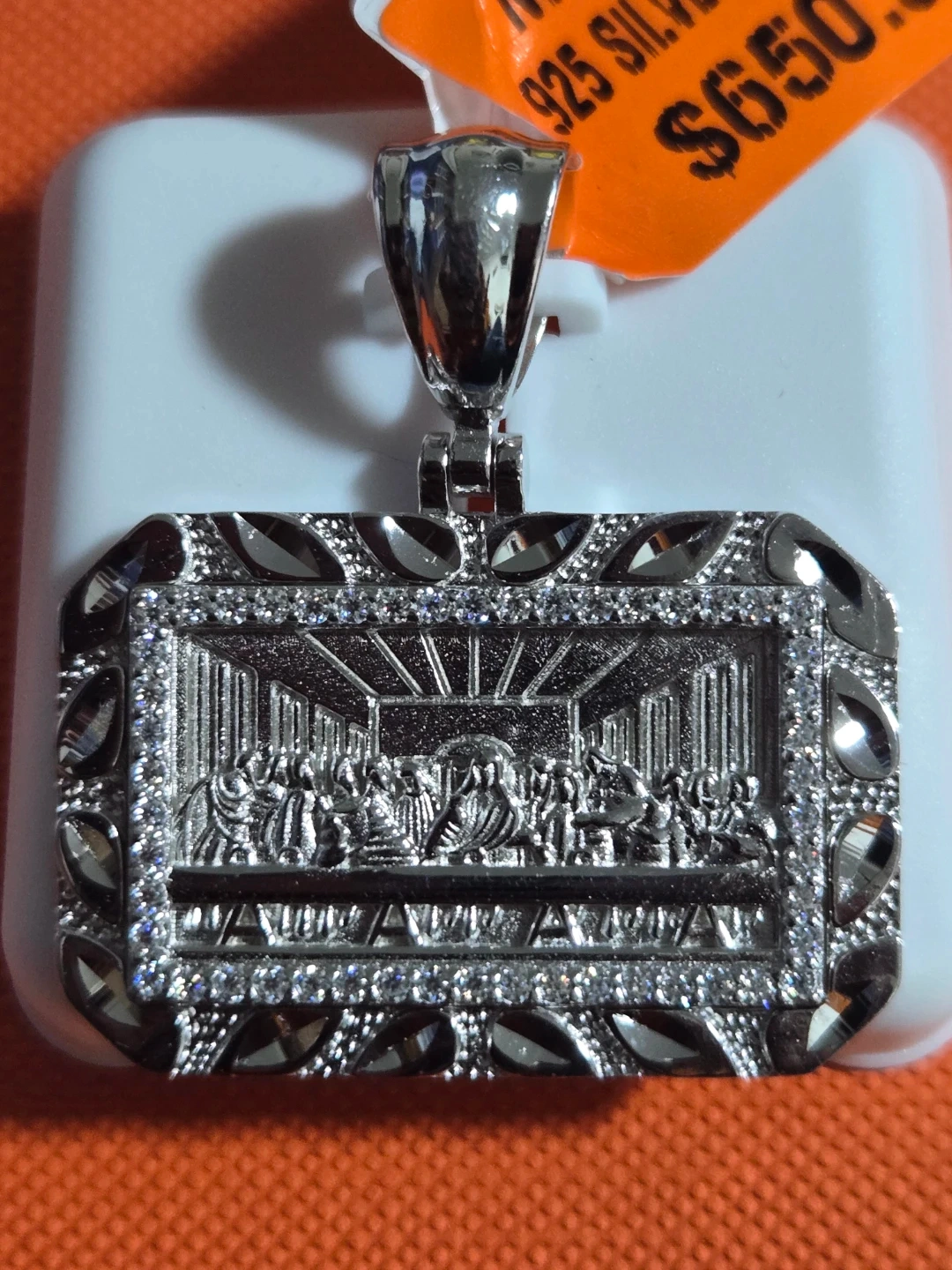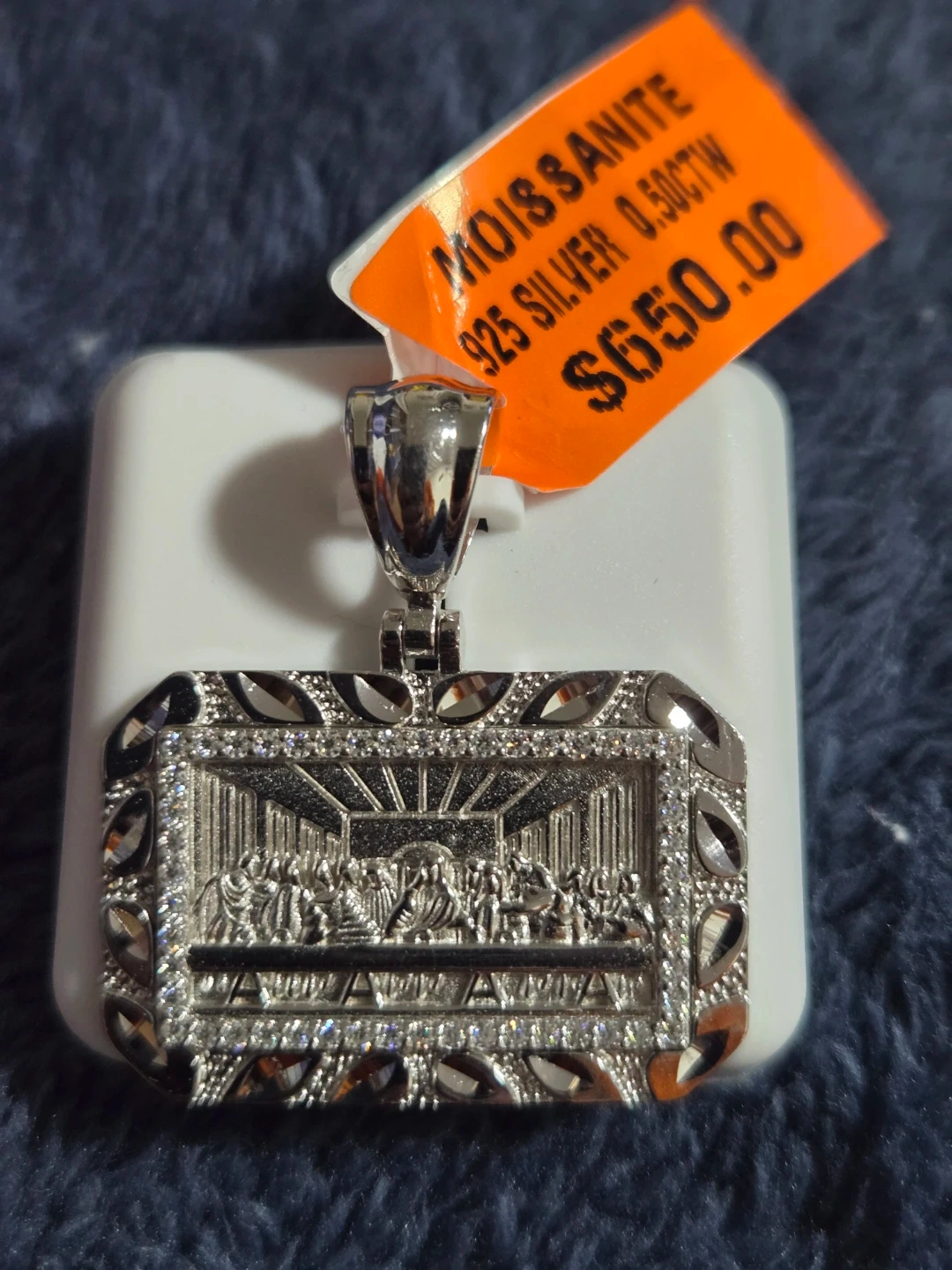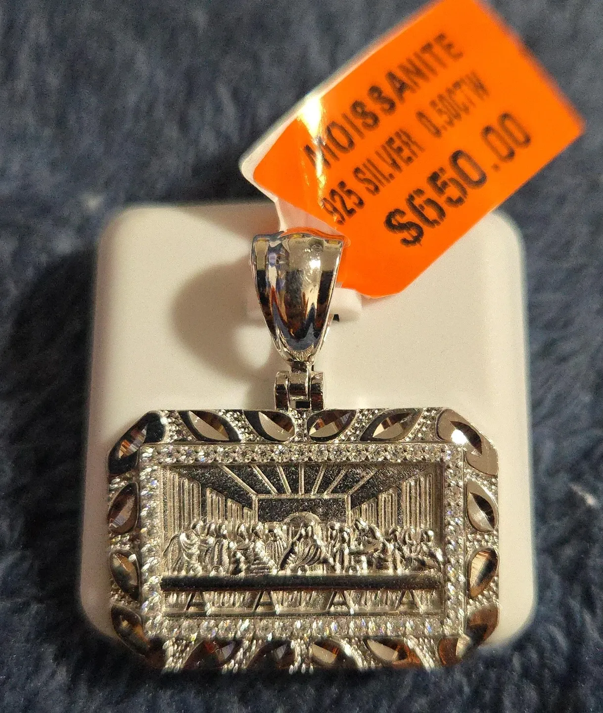 Selling a moissanite pendant made of 925 silver. It features a detailed design and is marked with 0.50CTW. The original tag shows a price of $650.00