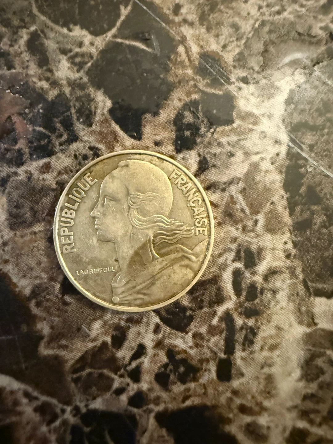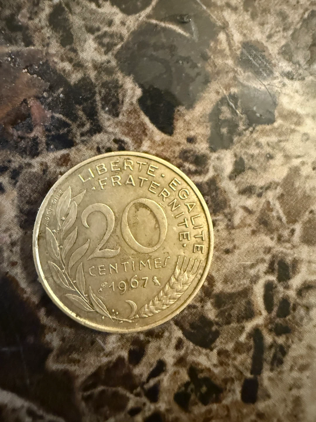 French 20 centimes coin from 1967. Features Marianne on one side and the denomination with the motto on the other. Made of metal.