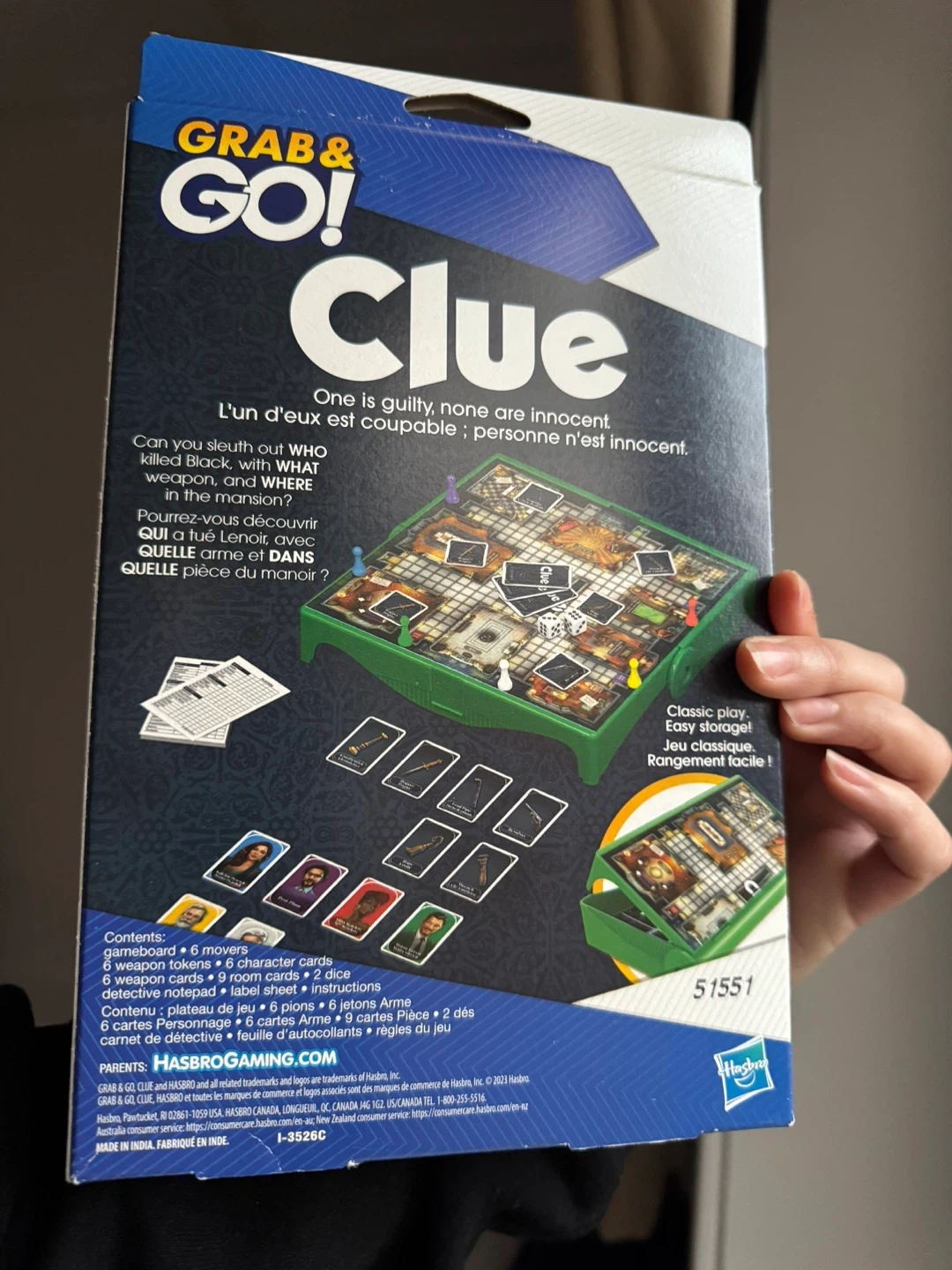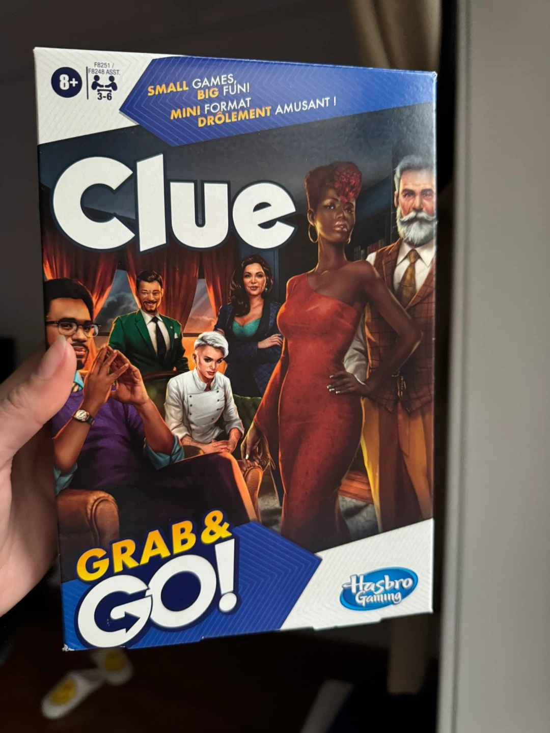 This is the Clue Grab & Go! travel-sized board game. It includes 6 movers, 6 weapon cards, 6 character cards, 1 die, 1 detective notepad, and a label sheet. It's designed for quick and easy play, perfect for on-the-go fun. Playable for ages 8 and up.