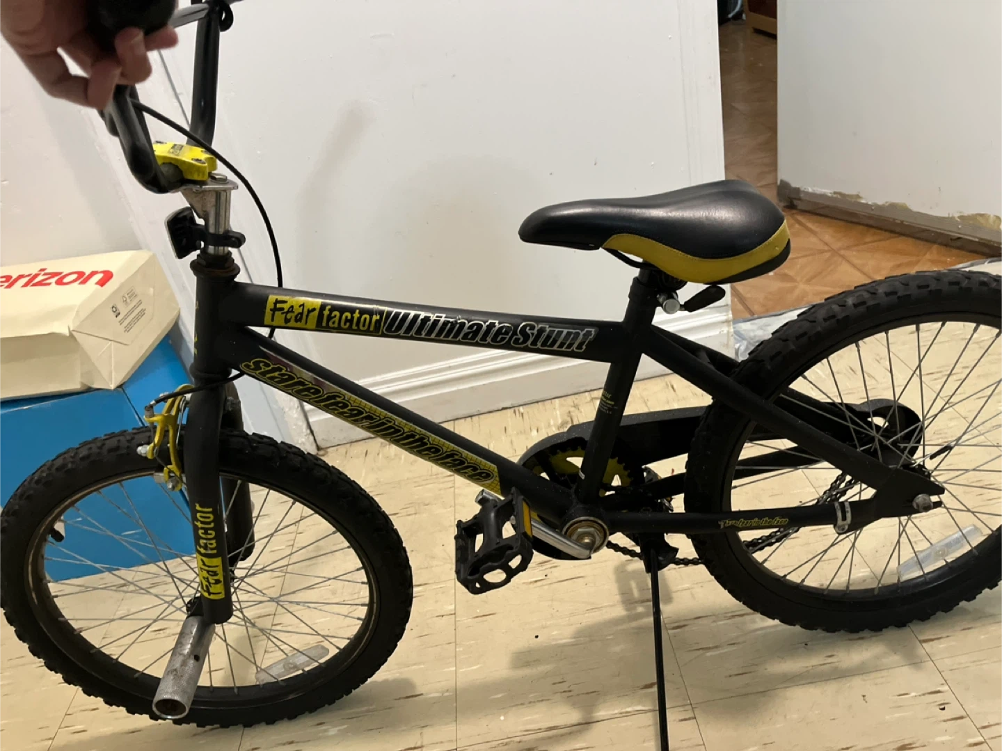 Selling a Fear Factor Ultimate Stunt bike. It features a black frame with yellow accents. Great for learning new tricks! (Chain needs to be fixed)