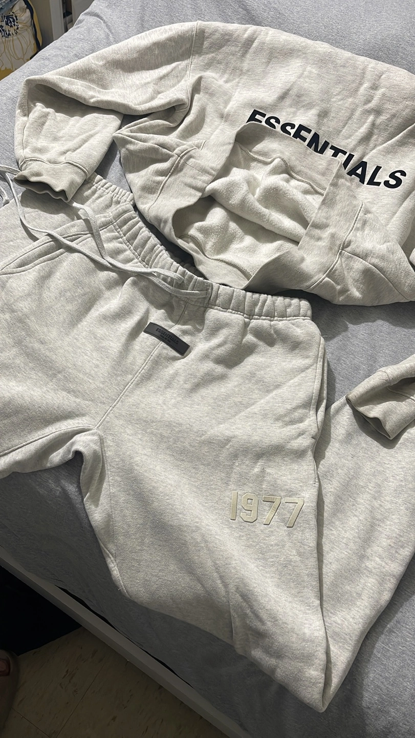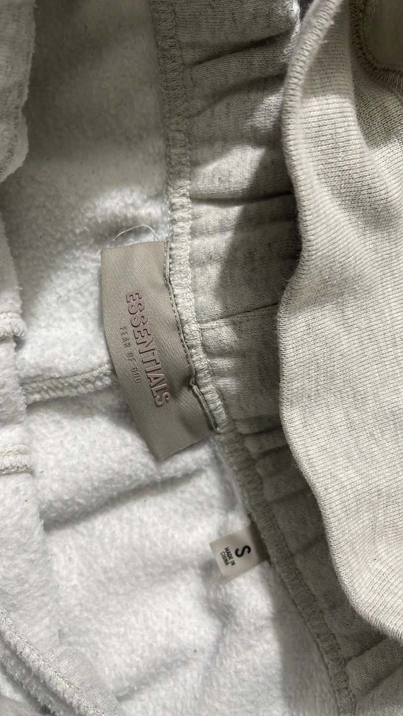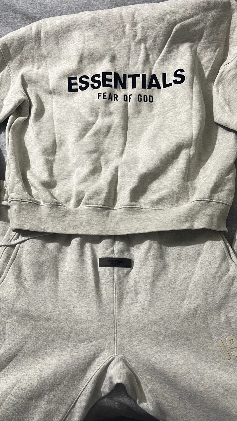 Grey sweatsuit. Includes matching crewneck sweatshirt and sweatpants. Size small. Features Essentials Fear of God branding.