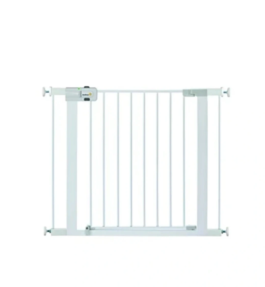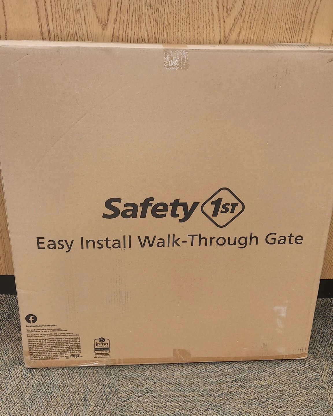 This is a Safety 1st Easy Install Walk-Through Gate. It's made of metal with a white finish. The gate is designed for easy installation and includes a walk-through feature. It comes in its original box.