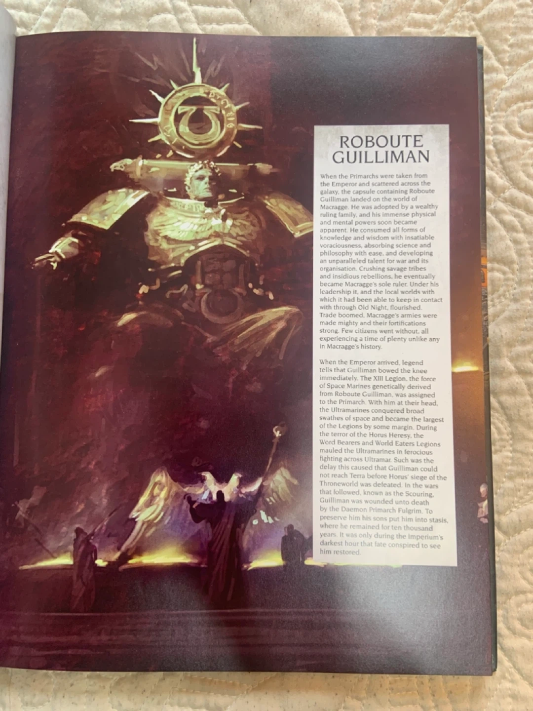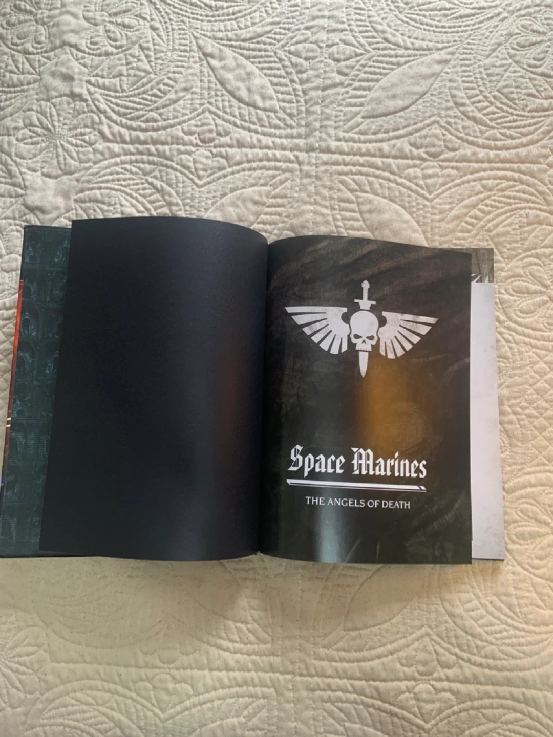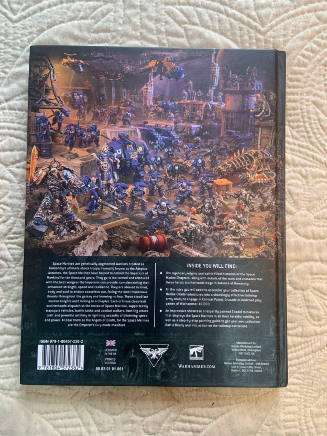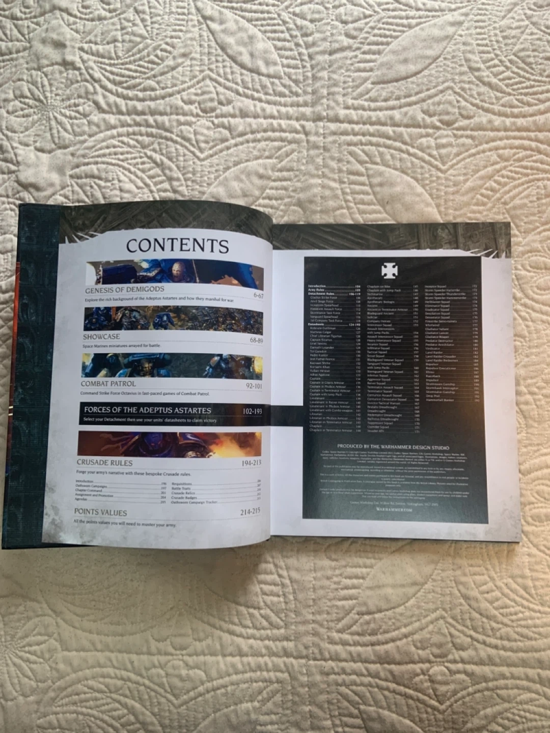 • The book contains extensive lore, artwork, and unit datasheets for the Space Marines.