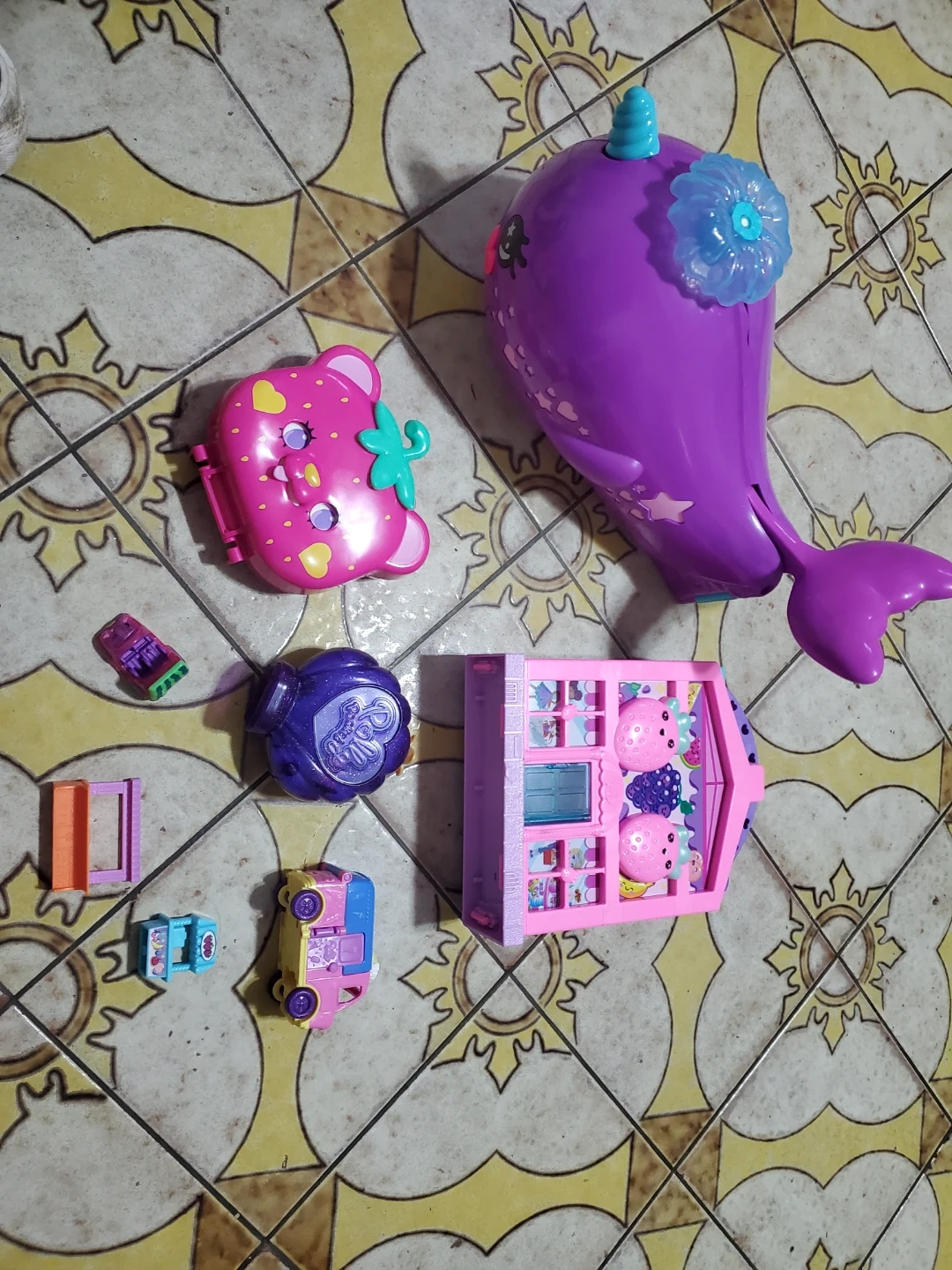 This is a collection of assorted Polly Pocket playsets and accessories. It includes a strawberry-themed compact, a narwhal-shaped compact, a camper van, and a miniature house playset.