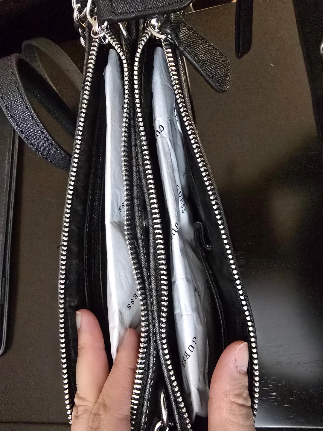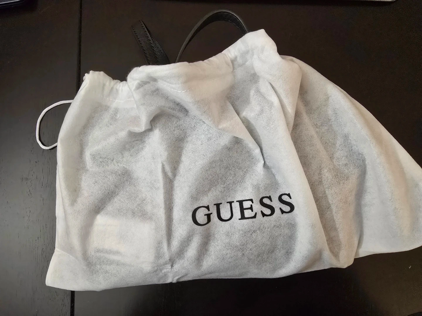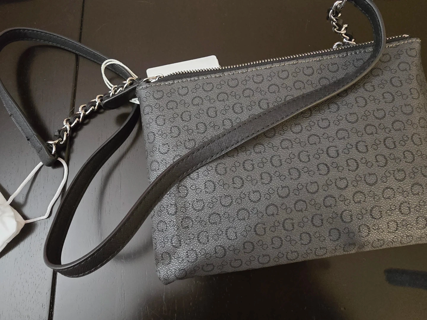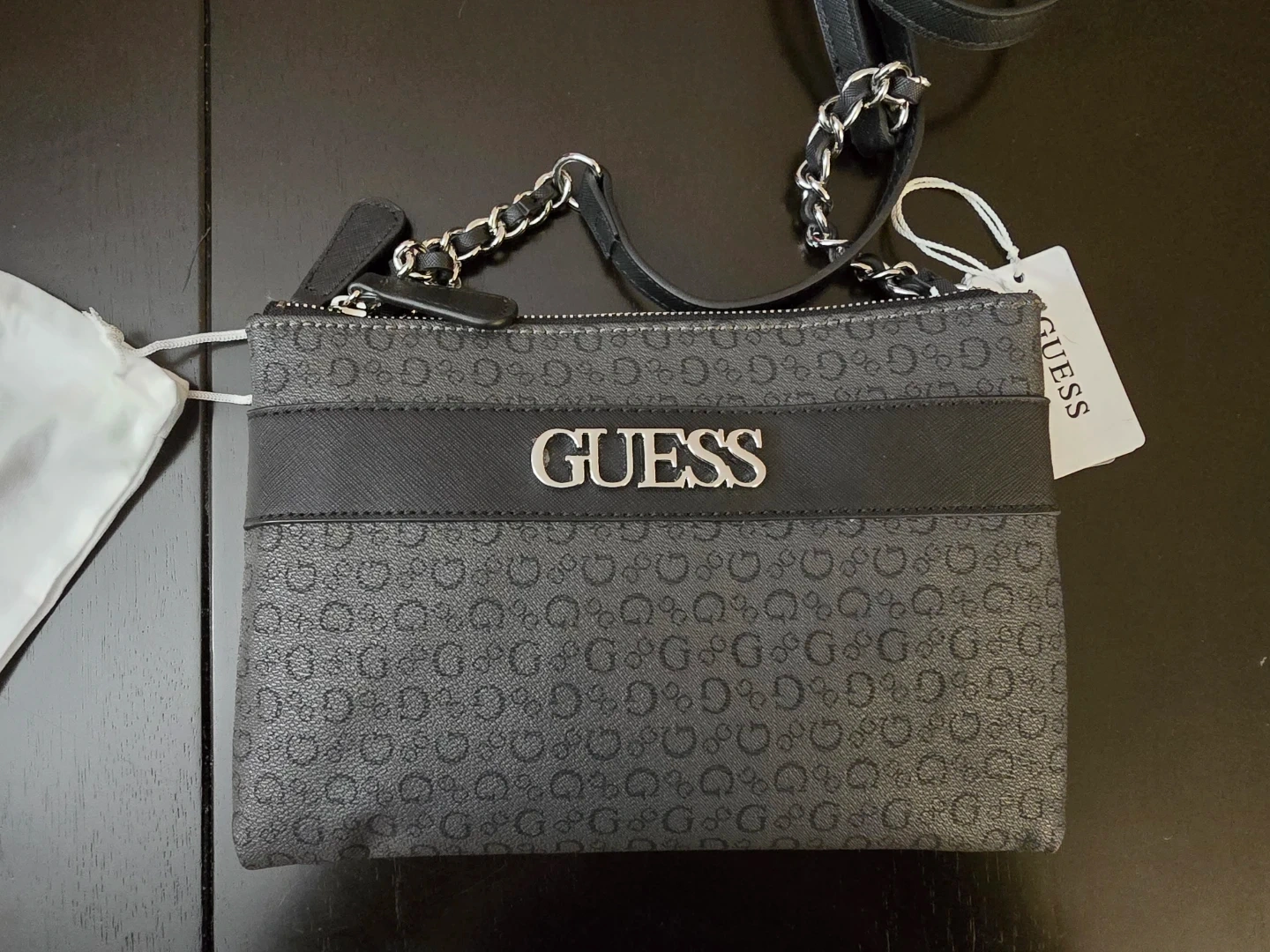This black Guess crossbody bag features the signature G logo pattern and a silver-tone Guess emblem. It includes multiple zippered compartments and comes with its original dust bag. It's perfect for everyday use!