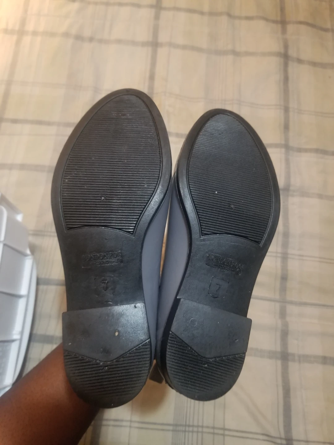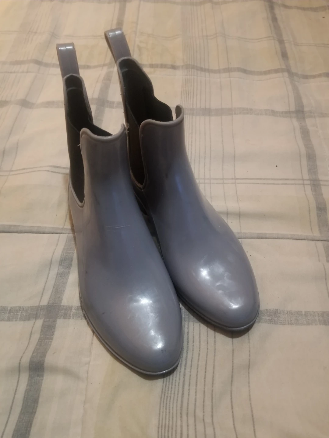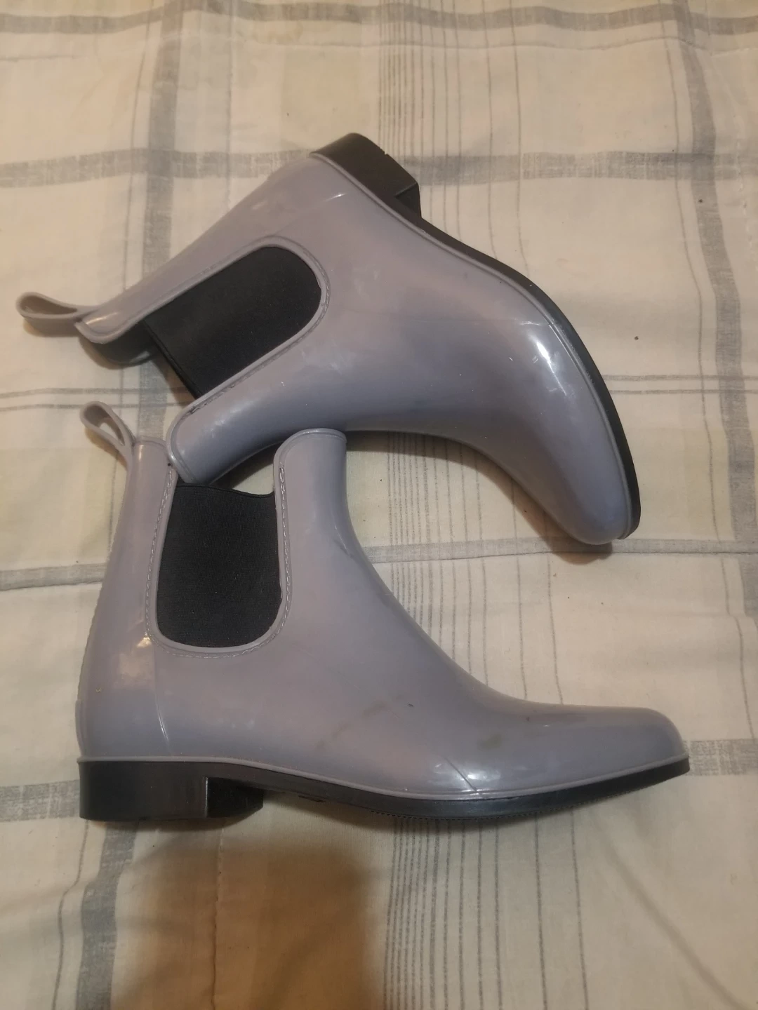 These grey London Fog Chelsea-style rain boots are a size 7. They're made of a waterproof material and feature elastic side panels for easy on and off. Perfect for keeping your feet dry on wet days! Asking $10