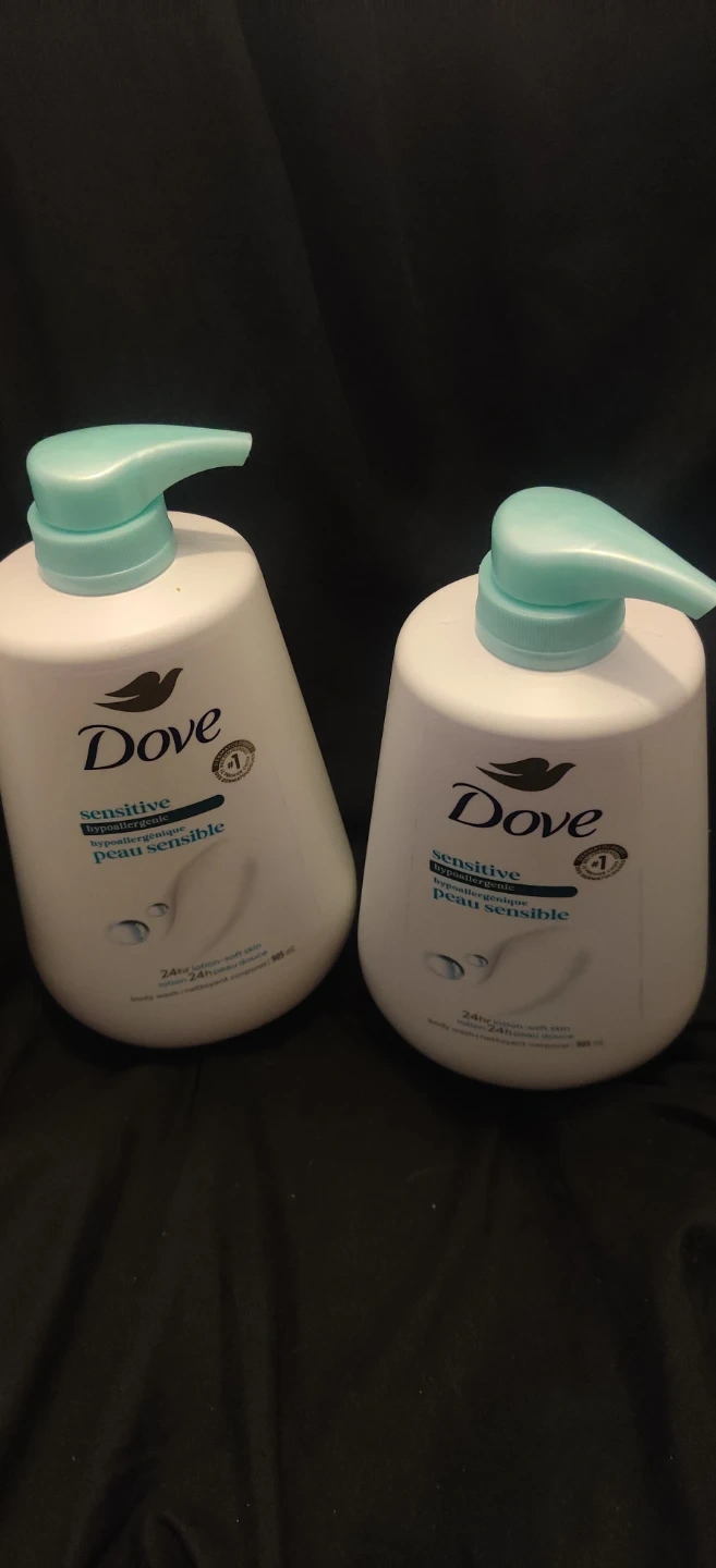 These Dove Sensitive body wash are hypoallergenic and formulated for sensitive skin. It provides 24hr lotion-soft skin. Comes in a 905 ml pump bottle.