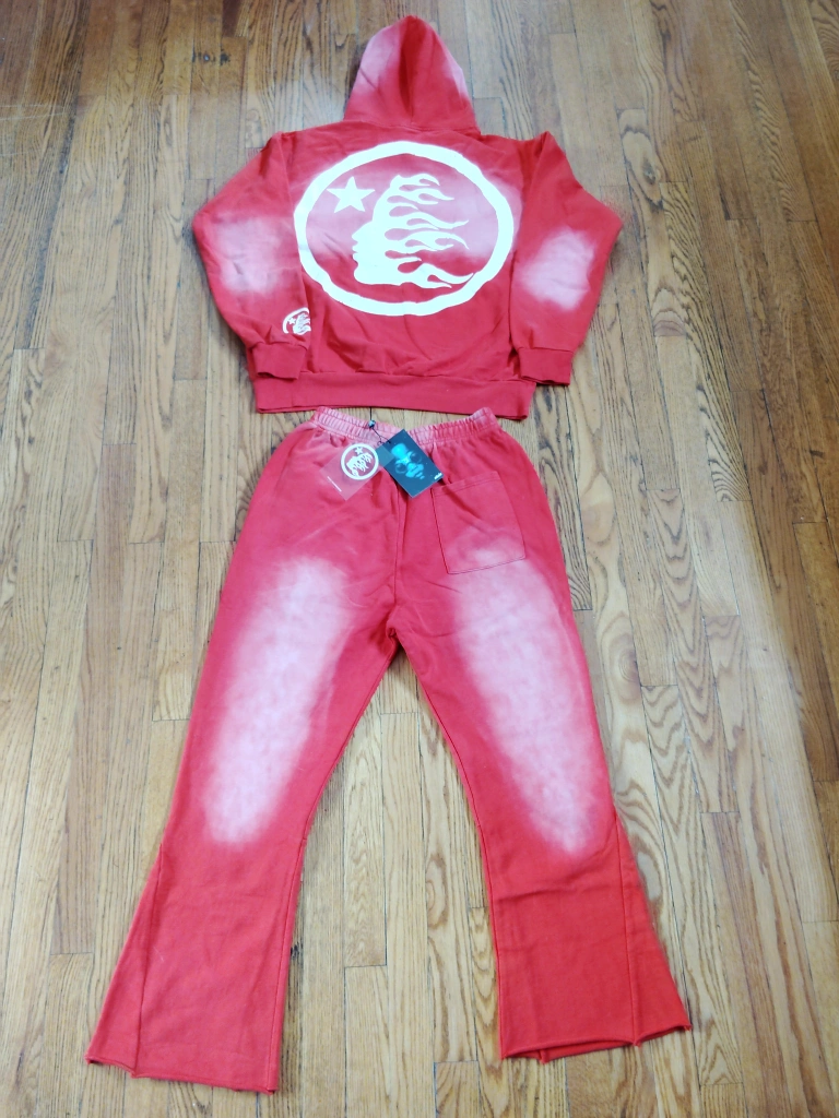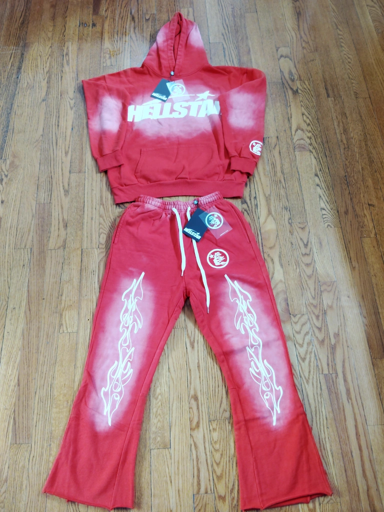 This is a Hellstar red hoodie and matching pants set. It's a tie-dye washed look with flame graphics. The hoodie has a drawstring hood and the pants have a drawstring waist.