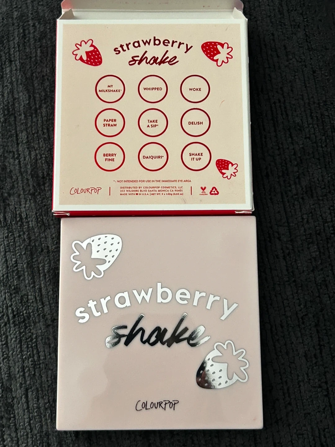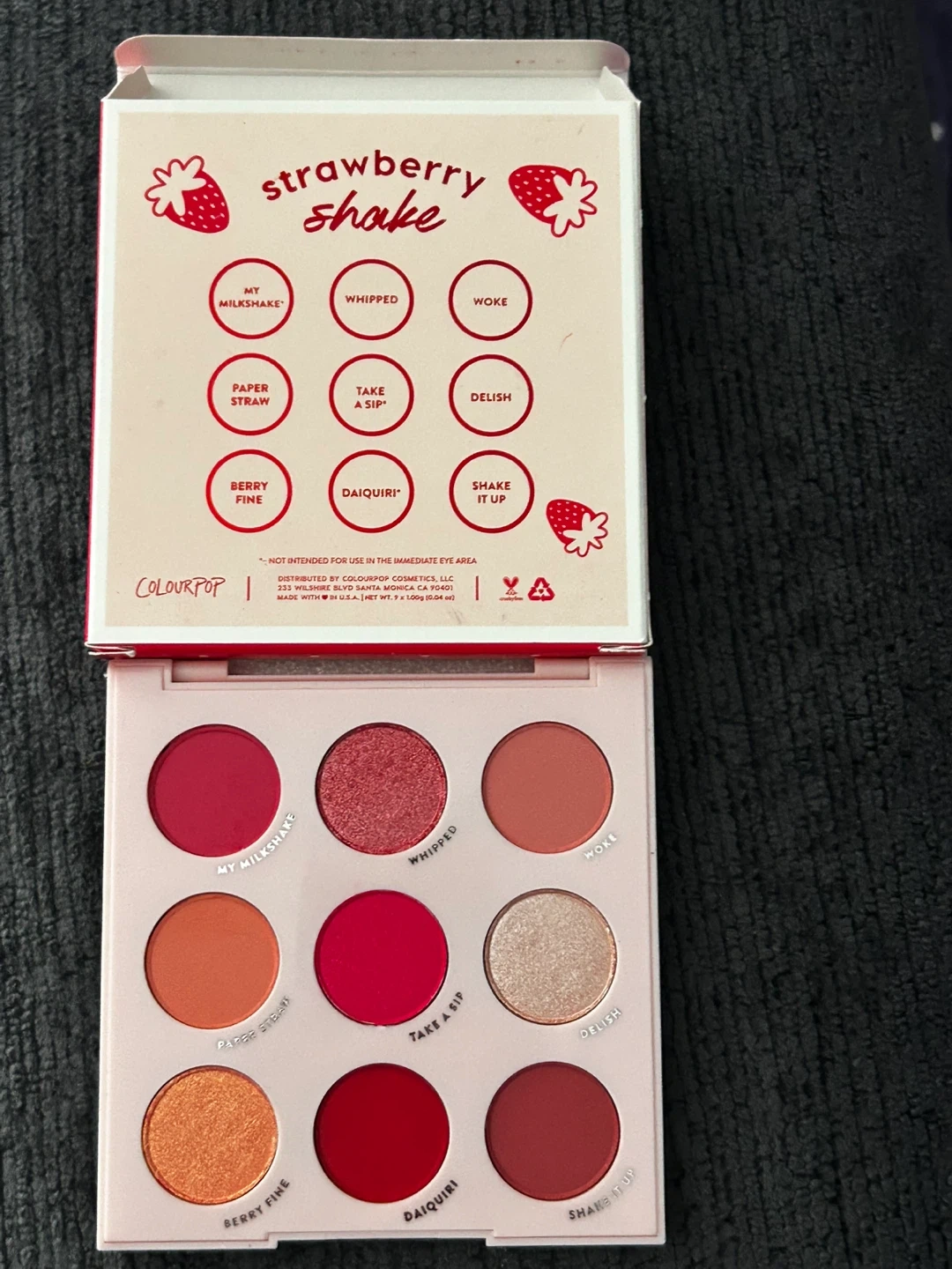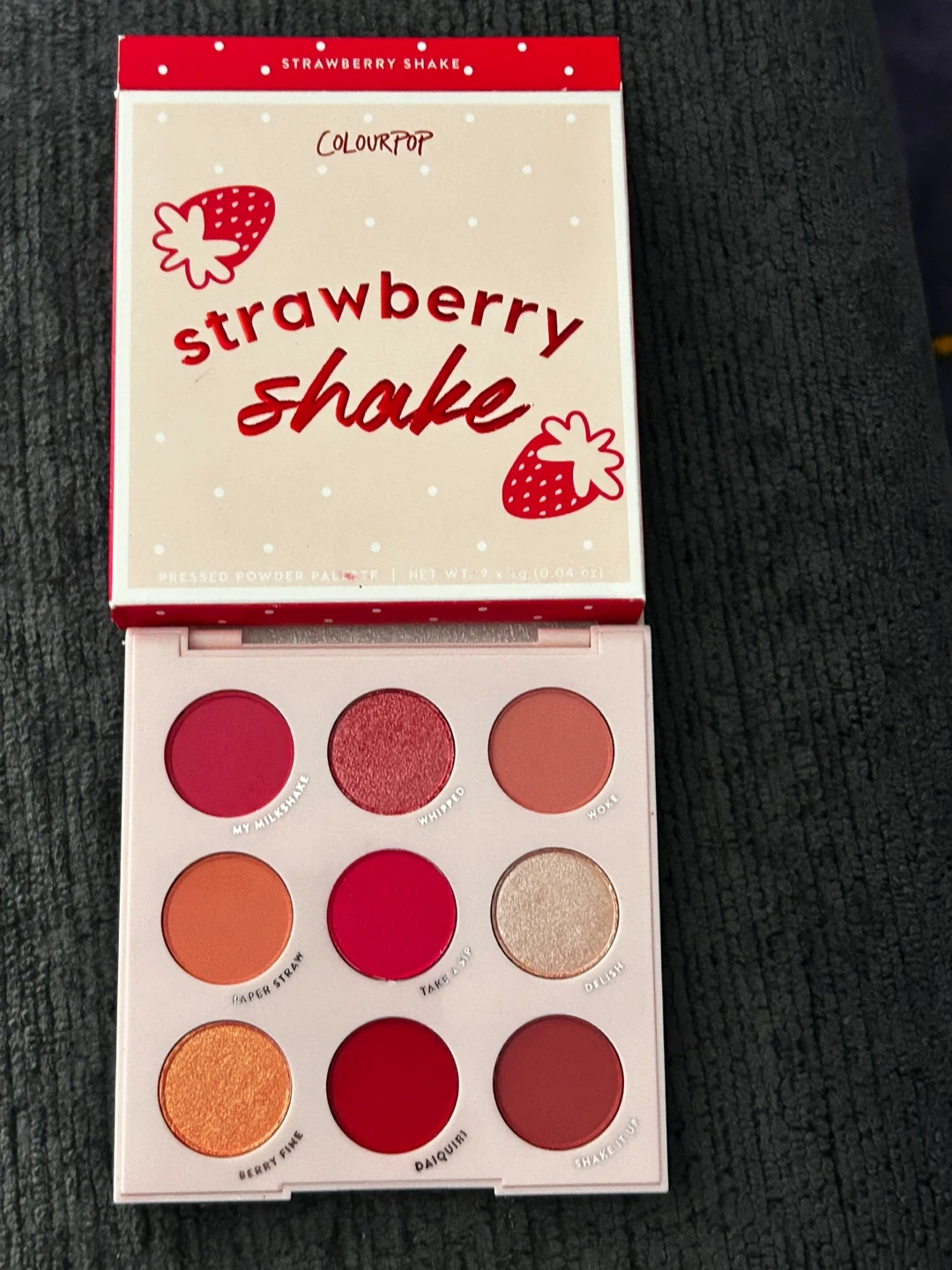 A ColourPop pressed powder palette featuring nine shades in a strawberry shake theme. Includes a variety of finishes and colours for versatile eye looks.