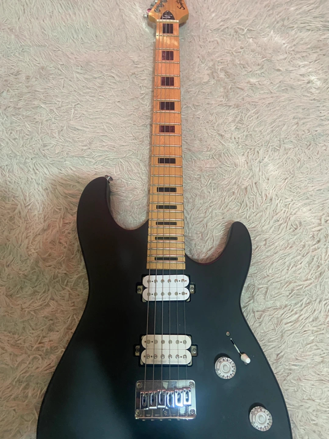 This is a black electric guitar with a signature on the headstock. It features two white humbucker pickups and a standard bridge. The fretboard is made of light-colored wood with dark fret markers.
