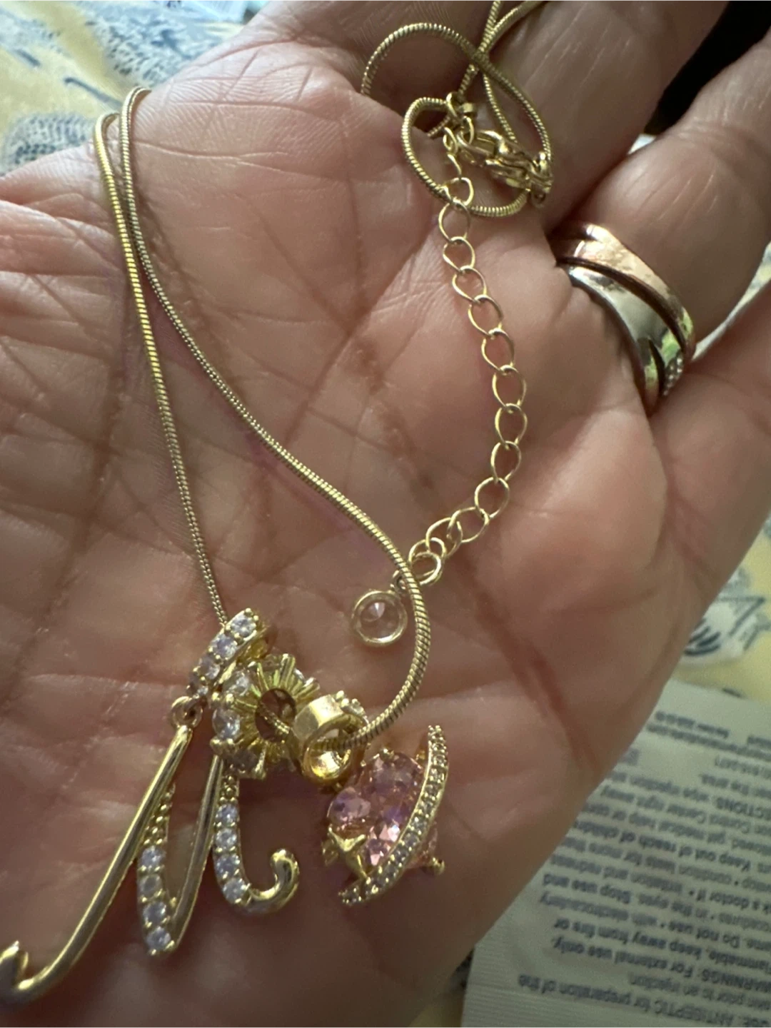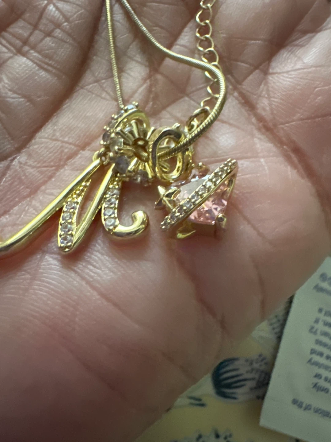 14k gold laminated necklace features an 'M' initial pendant embellished with clear rhinestones. It also has a detachable pink charm. It's a lovely accessory for everyday wear!