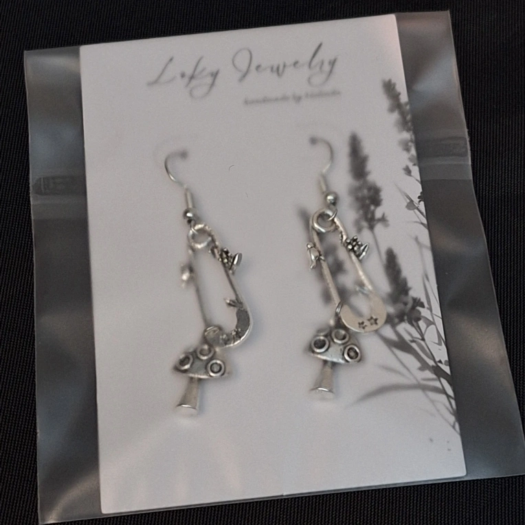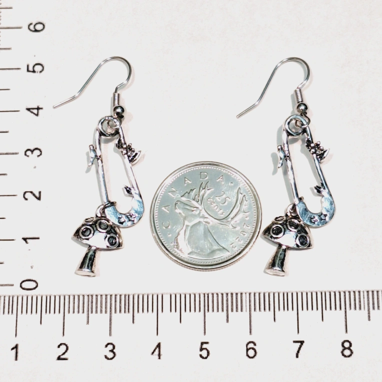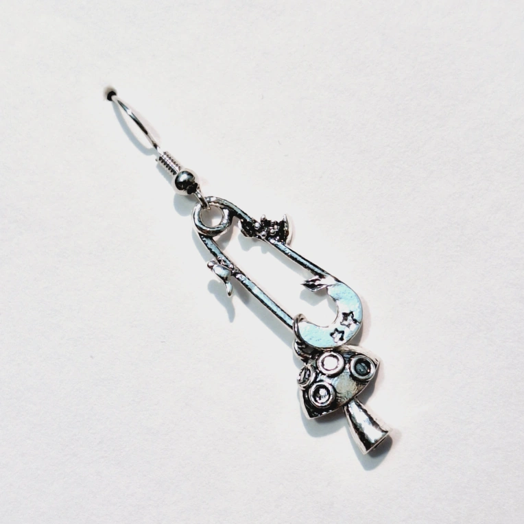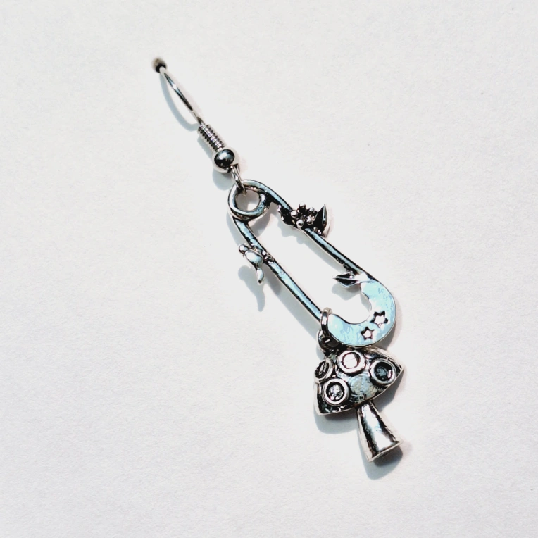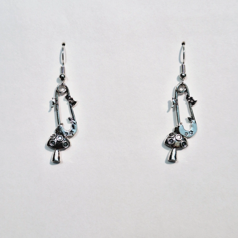 Unique silver tone earrings. Feature a mushroom and safety pin design. Lightweight and dangle nicely. Perfect for adding a touch of whimsy to any outfit. New, never worn.