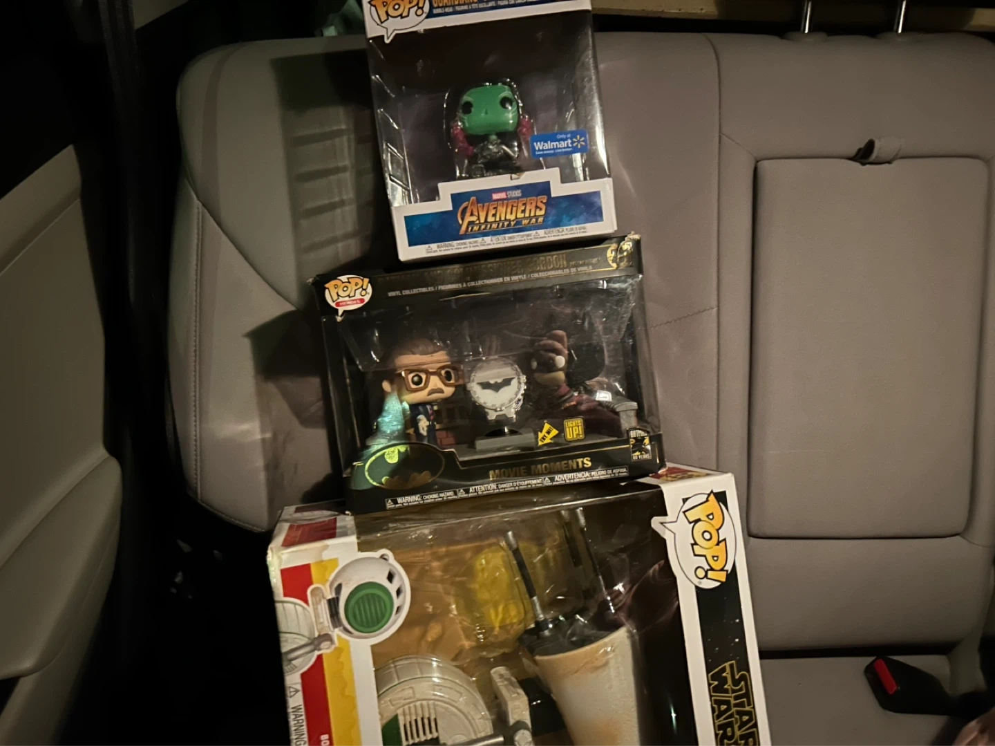 Three Funko Pop! figures are included: one from Avengers: Infinity War, one Movie Moments Batman figure, and one Star Wars figure. All come in original boxes.
