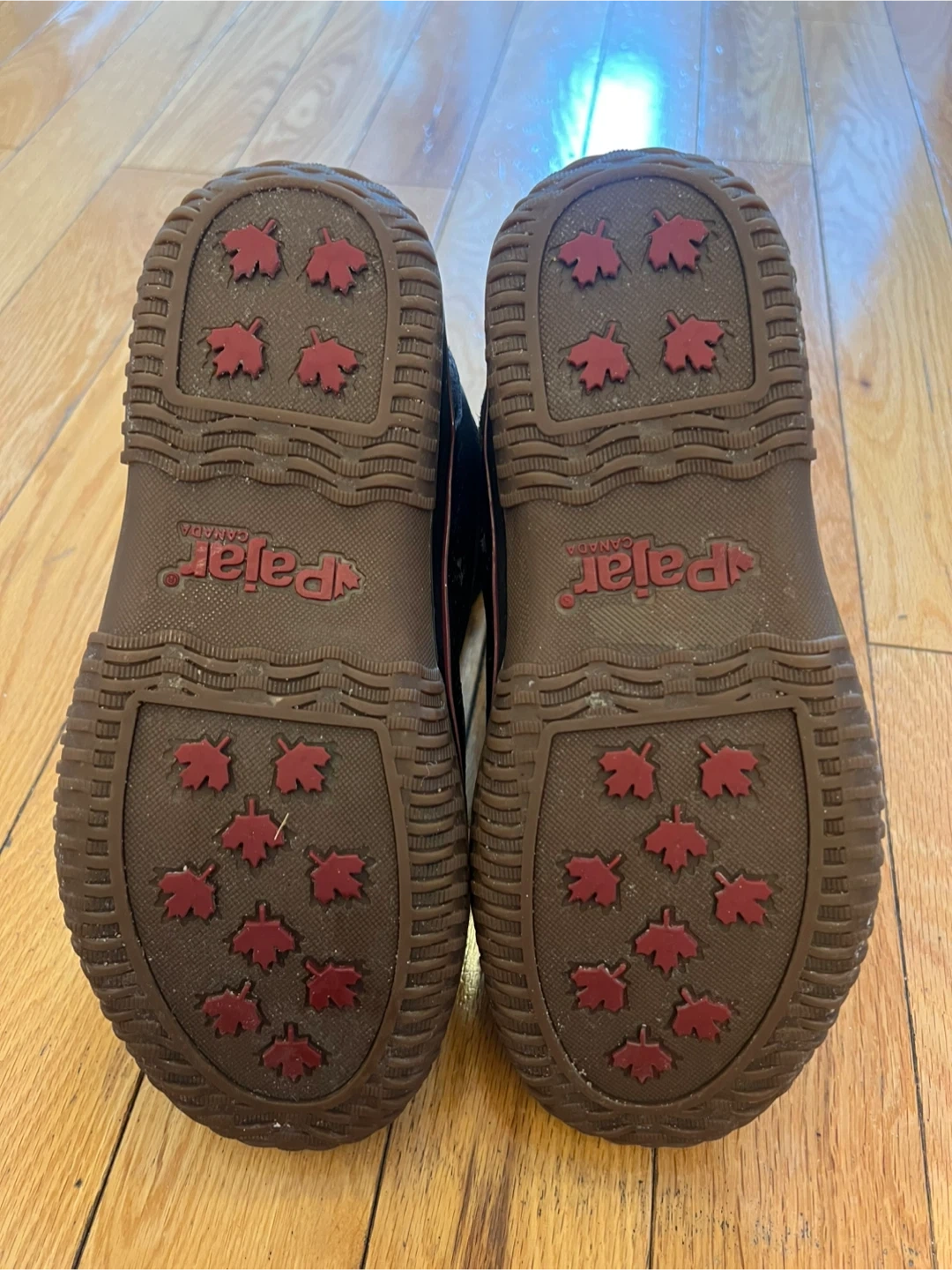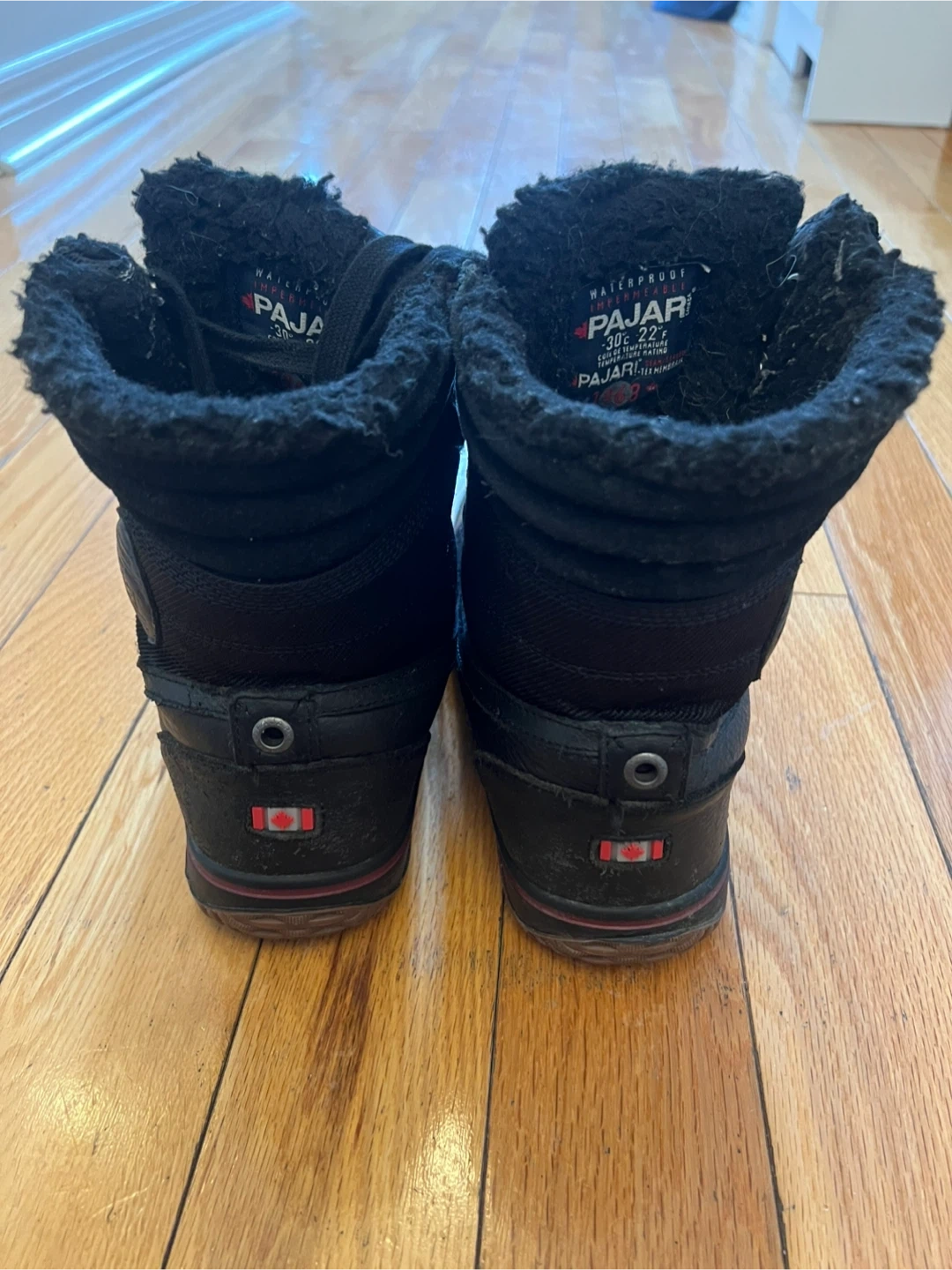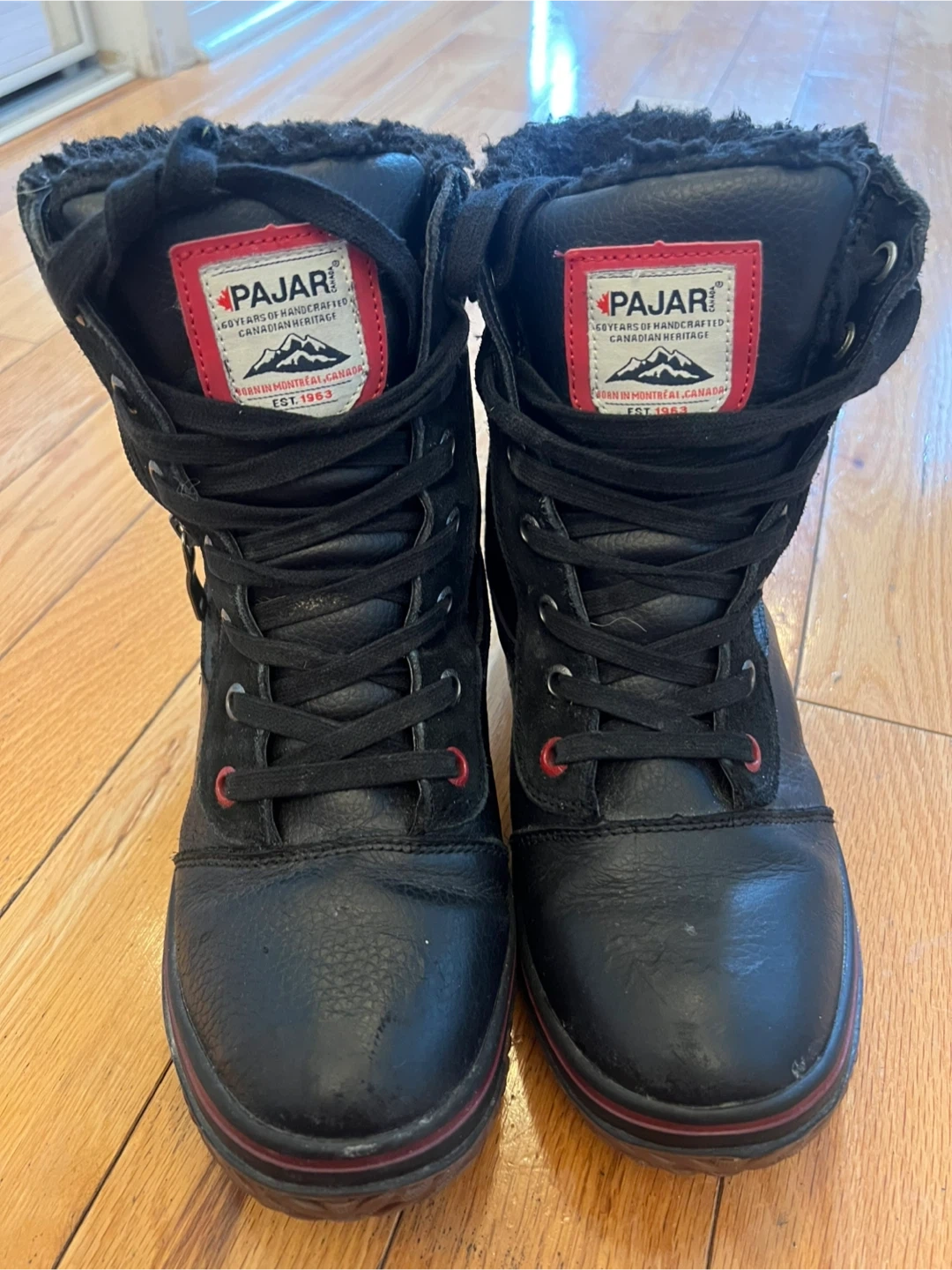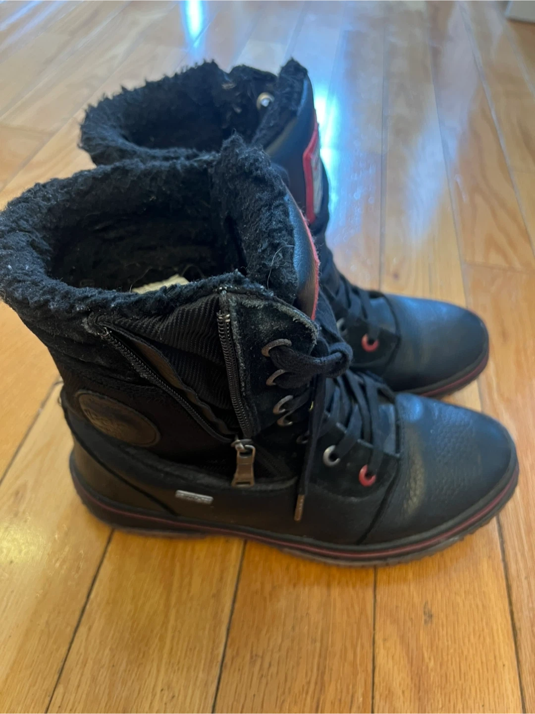 Pajar men's winter boots. Black colour with red accents. Size is Men's US 8-8.5.