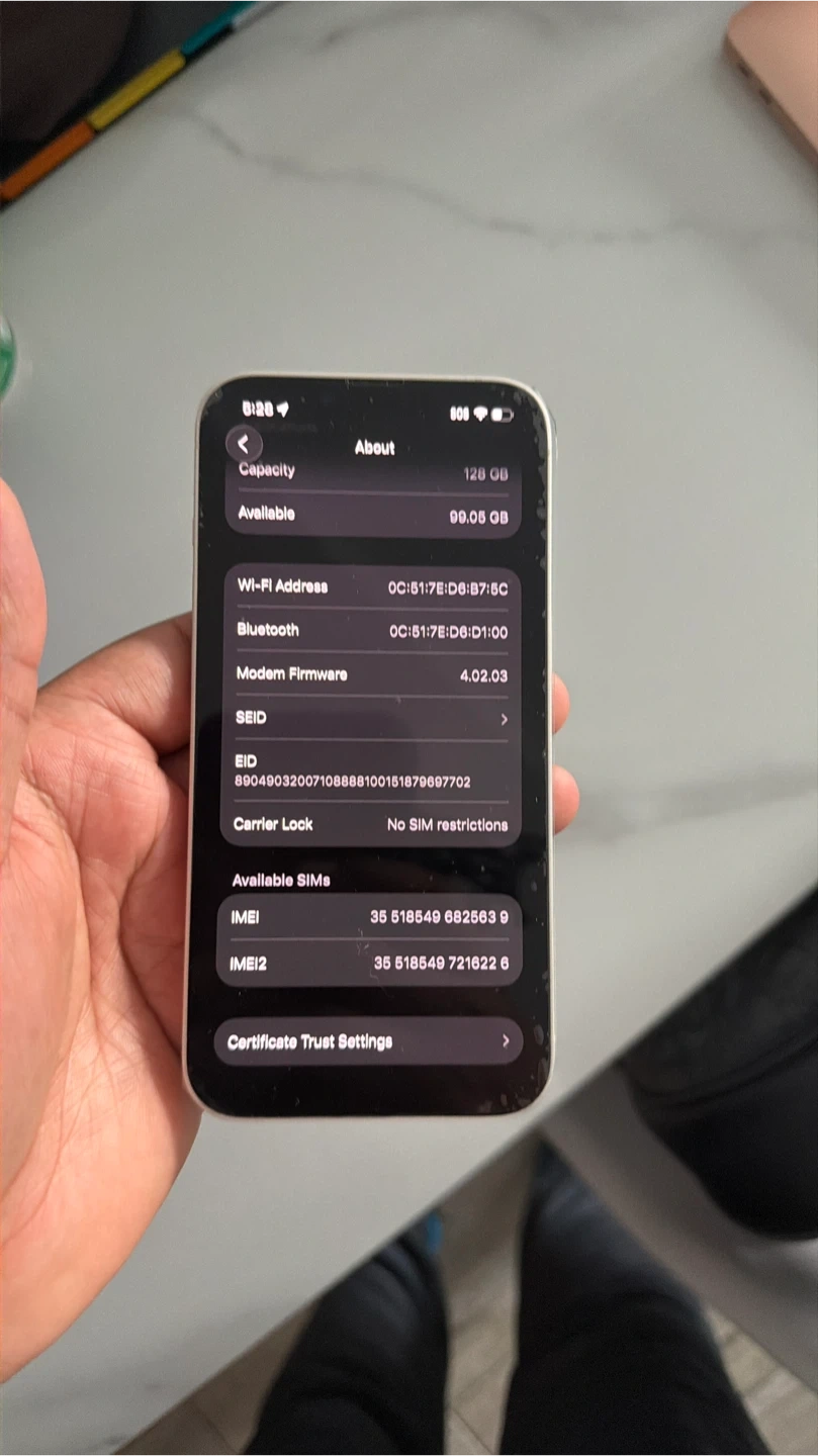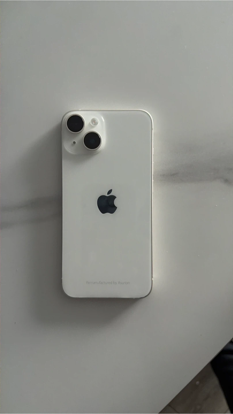 Fully unlocked Apple iPhone 14 with 128GB storage in white. Phone's maximum battery capacity is 100%. This device is remanufactured by Asurion. It has no SIM restrictions.