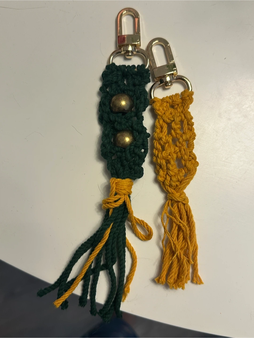 Handmade macrame keychain set in deep green and gold colours. One keychain features two brass-coloured beads, while the other has a braided design. Both have tasseled ends and gold-tone clasps.