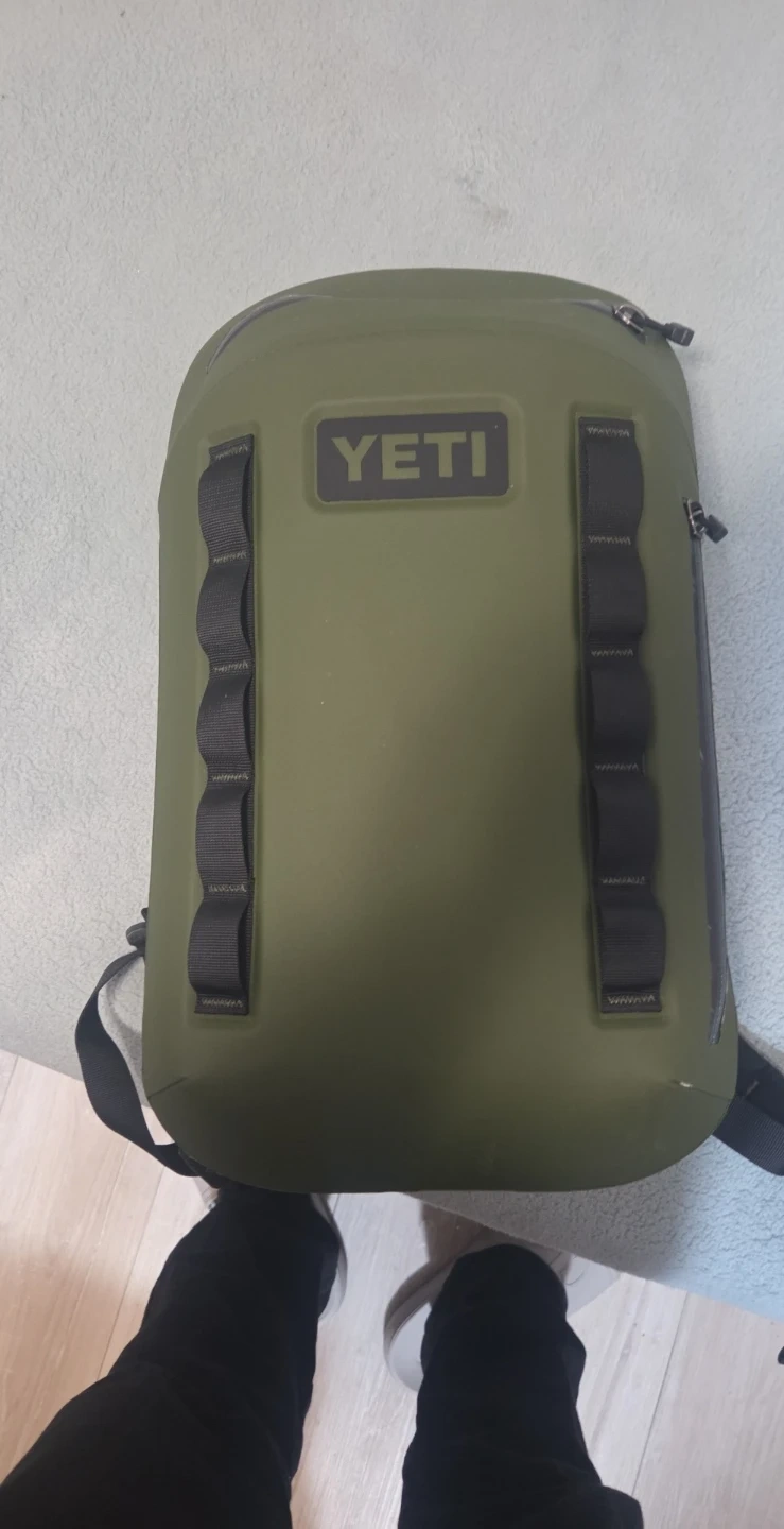 YETI backpack in green. It's made from durable, waterproof material. Features MOLLE webbing for customization. This bag's rugged build makes it great for outdoor adventures!