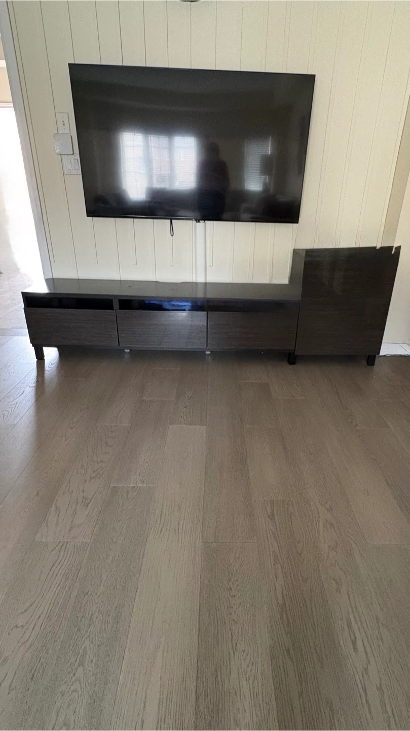 A sleek entertainment unit with a dark wood finish. It features three drawers for storage and a modern design. This unit provides ample space for media consoles and accessories.