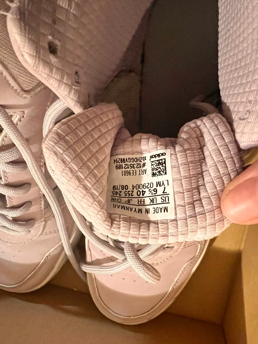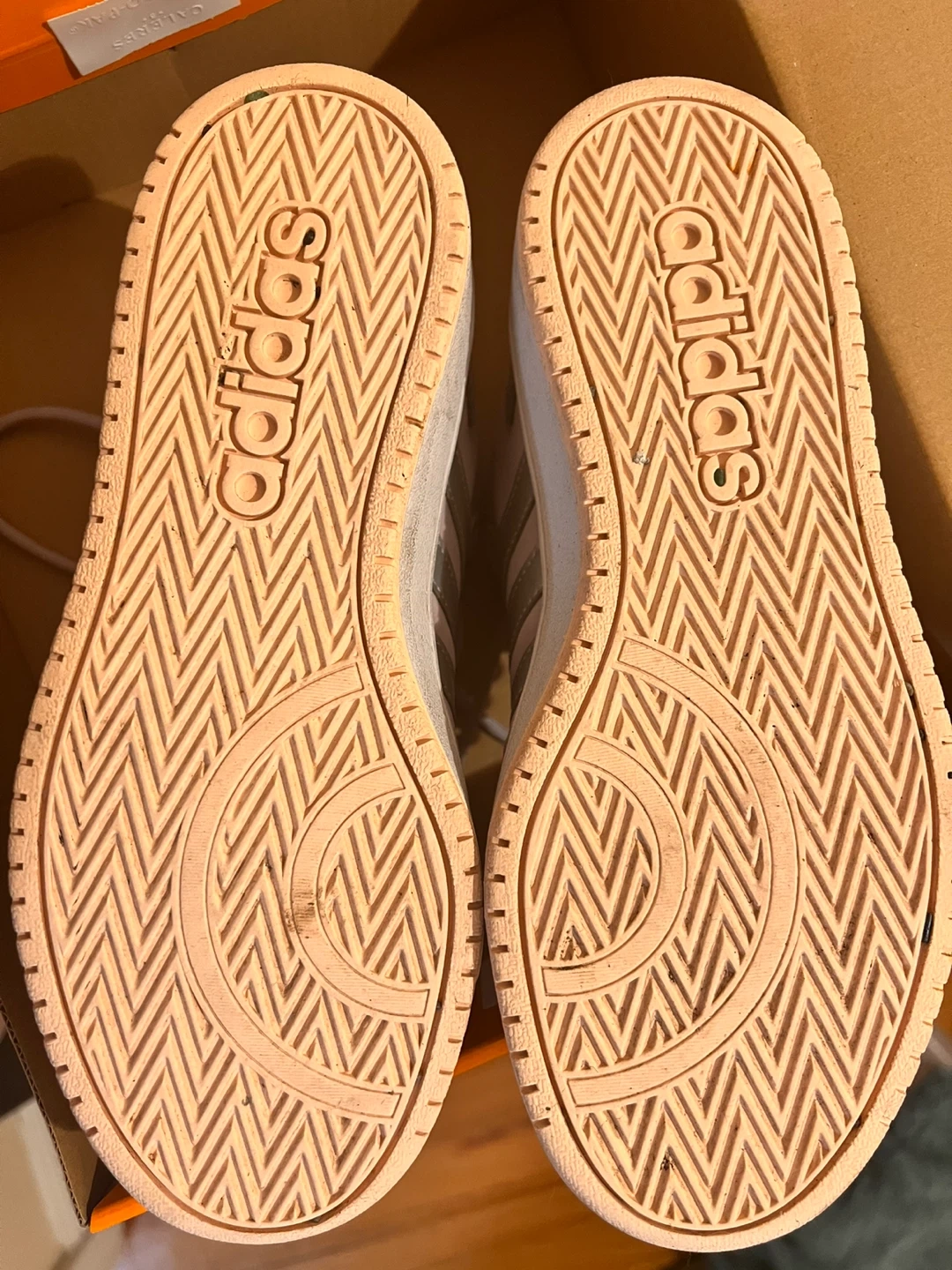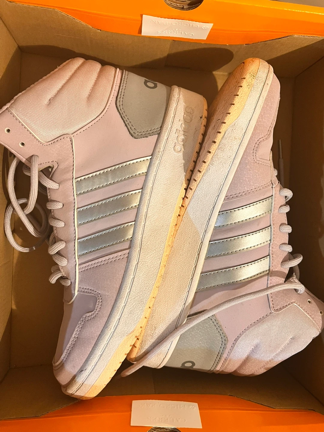 Adidas women's high top sneakers. Pink with silver stripes. US size 7, UK size 6.5, EU size 40. Made in Myanmar.