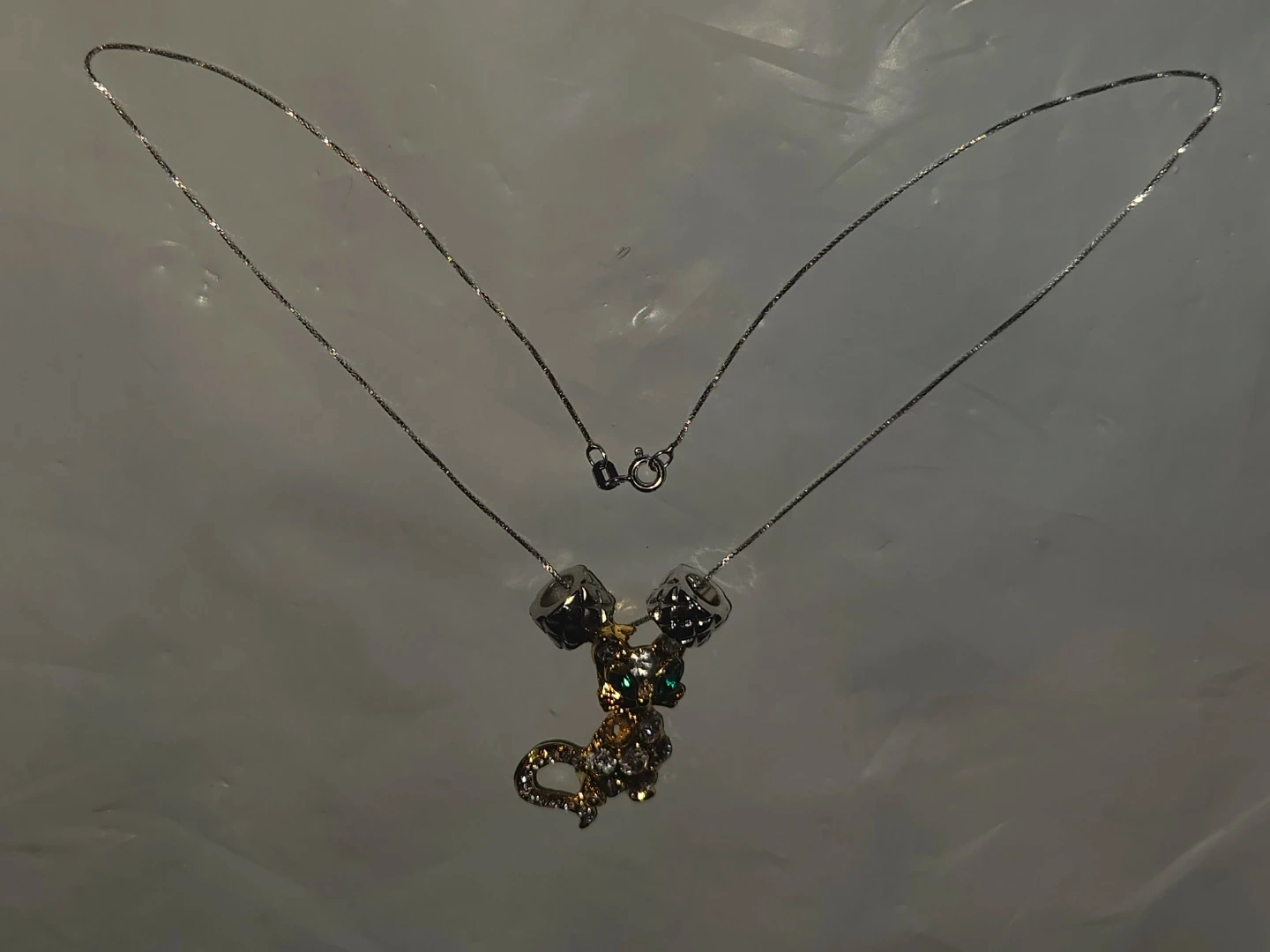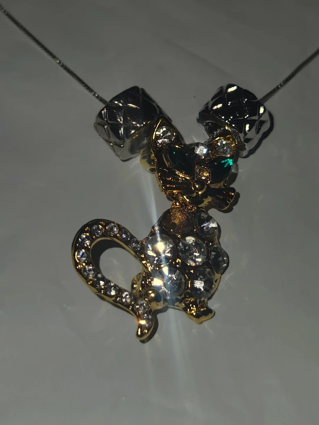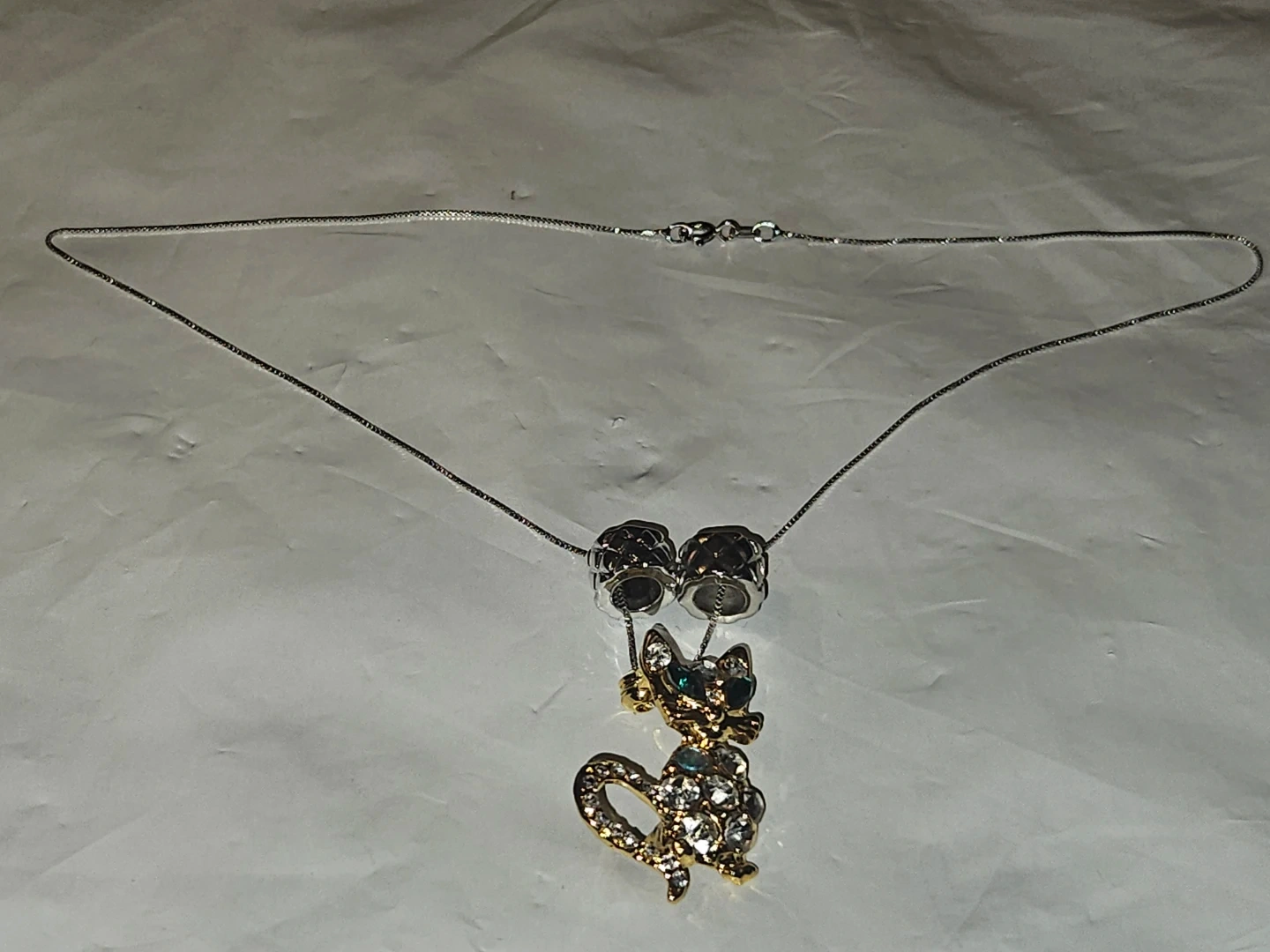 This necklace S925 Italian silver chain Necklace features a sparkly gold-toned cat pendant with clear and green rhinestones. It's strung on a delicate silver-toned chain. A fun accessory for any cat lover!