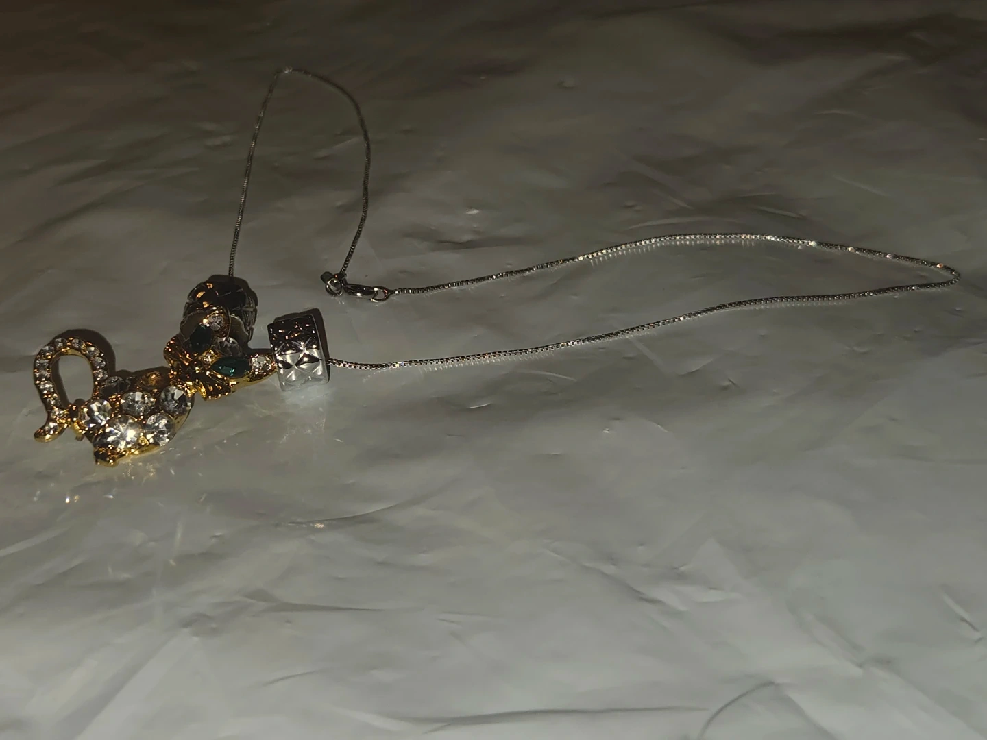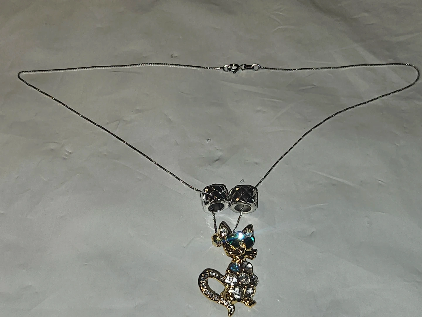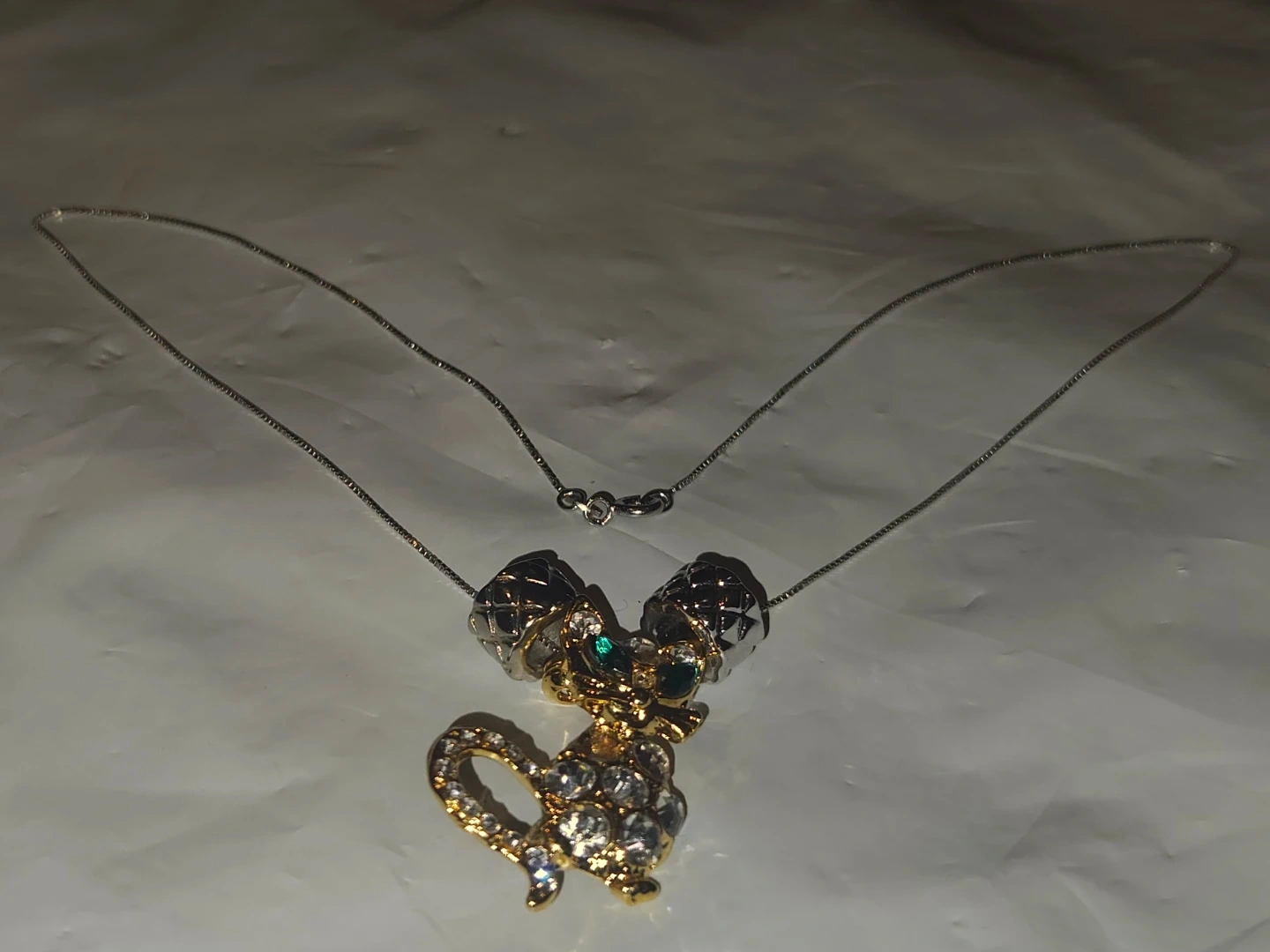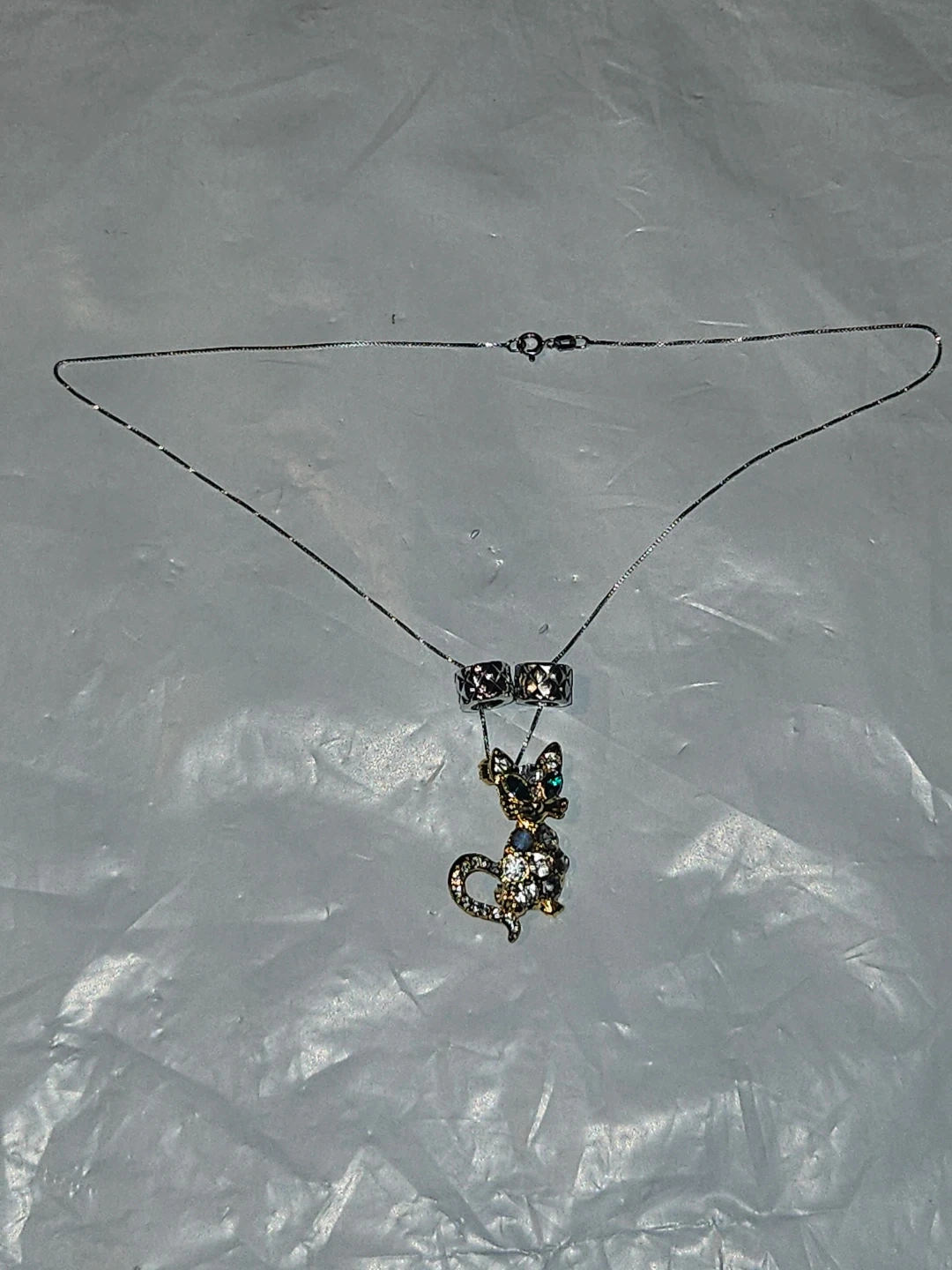 This necklace S925 Italian silver chain Necklace features a sparkly gold-toned cat pendant with clear and green rhinestones. It's strung on a delicate silver-toned chain. A fun accessory for any cat lover!