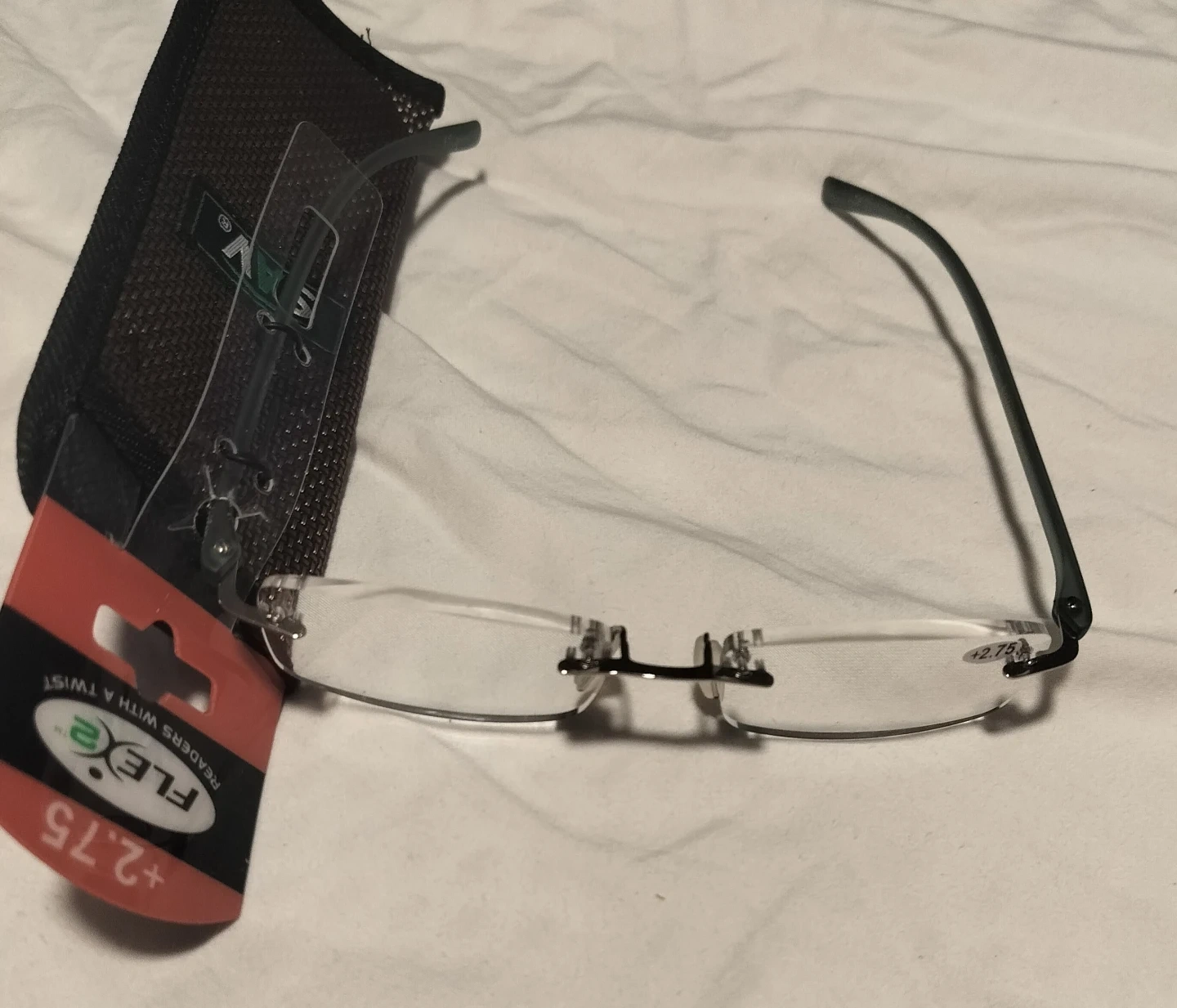 These Sav Readers glasses feature a +2.75 magnification. They're rimless with flexible arms for a comfortable fit. Includes a protective case.
