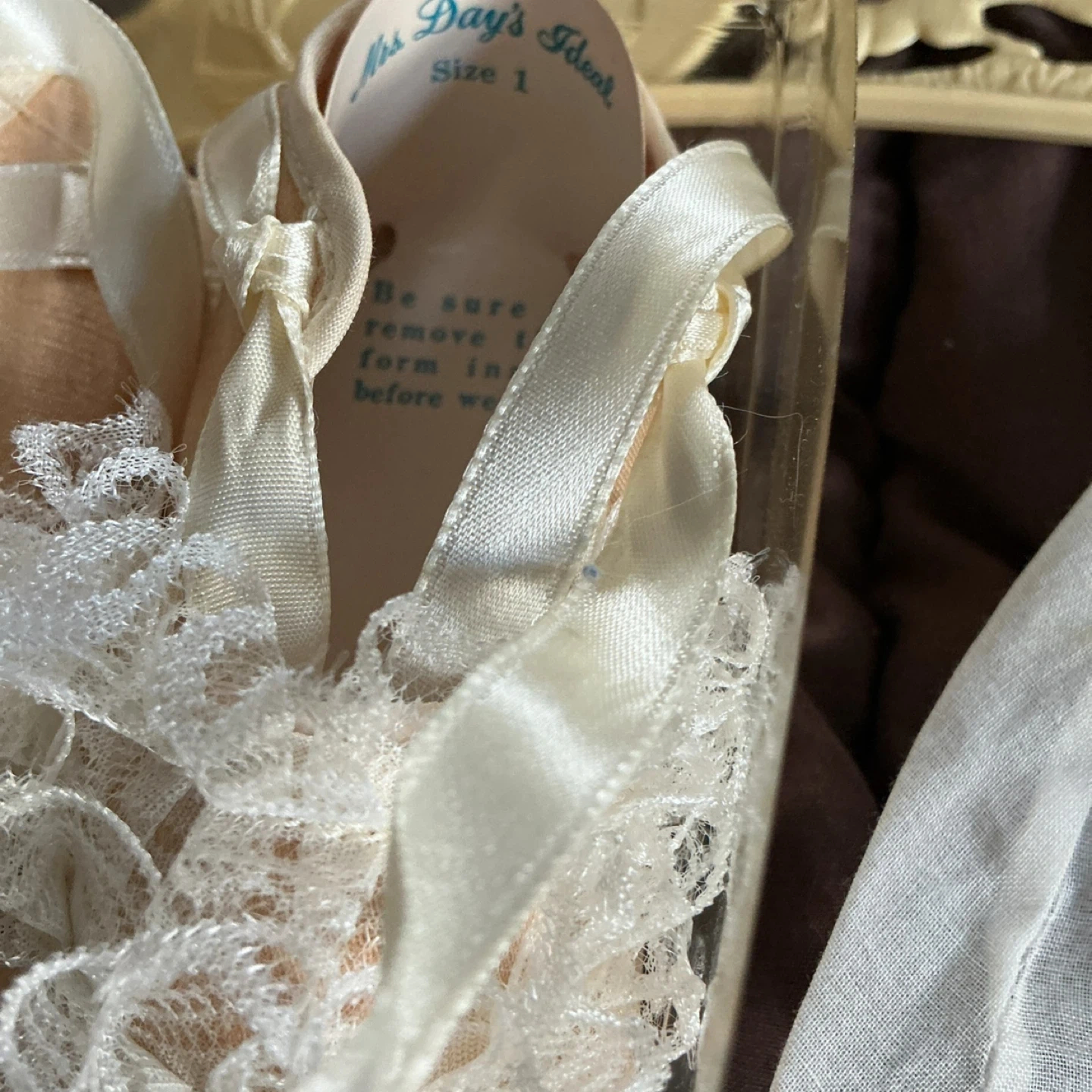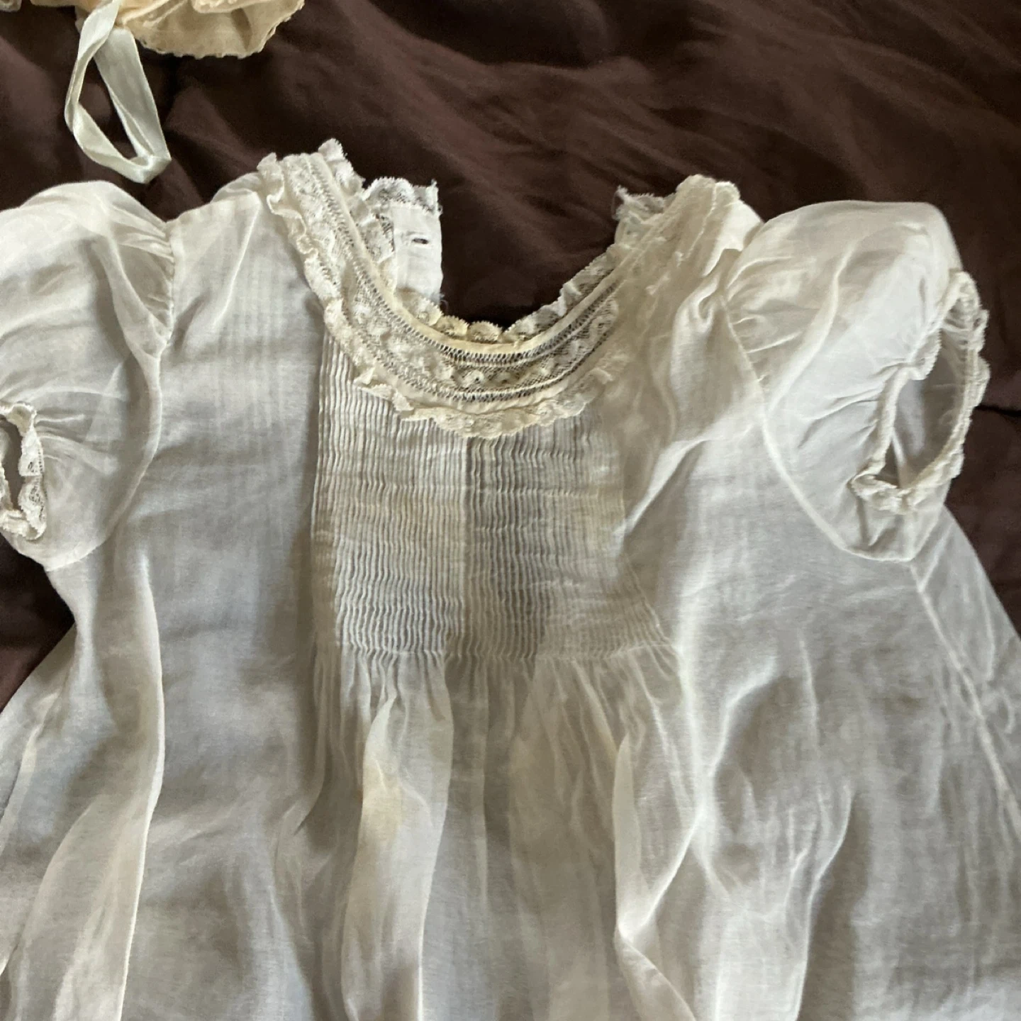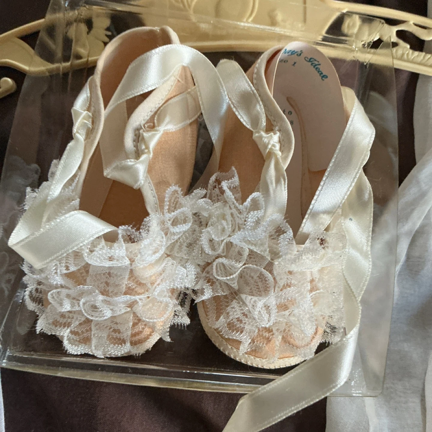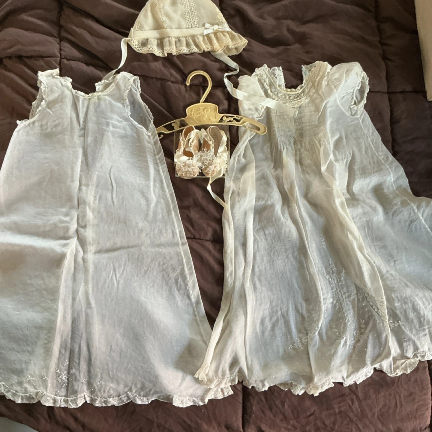 This sweet set includes a delicate christening gown and matching bonnet, both adorned with intricate lace and embroidery. Also includes a pair of tiny, decorative ballet shoes. Perfect for a special occasion!