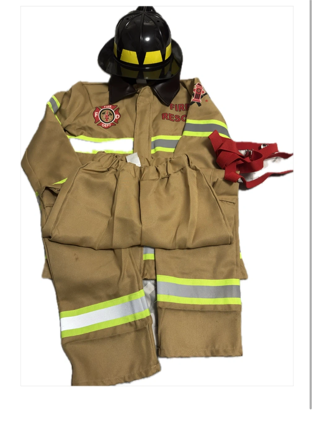 111Fire Dept Fire Rescue costume set, great for dress-up and imaginative play! Includes a jacket, pants, helmet, and suspenders. Perfect for your little firefighter!