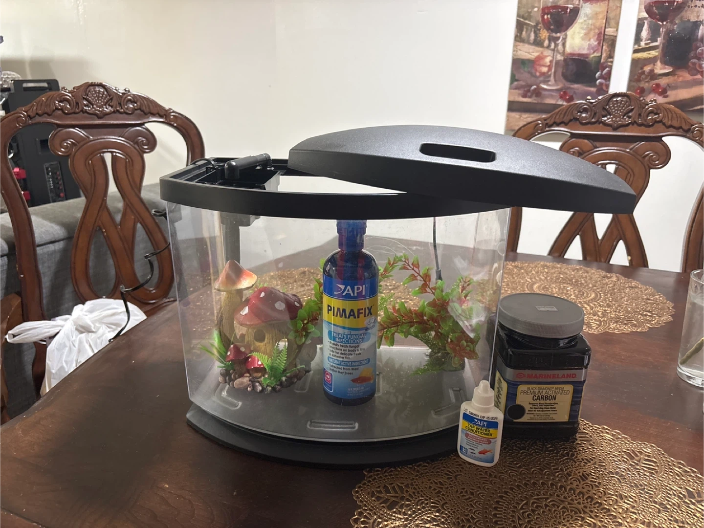 Selling a fish tank that comes with some accessories. Includes: - Marineland Premium Activated Carbon - API PIMAFIX to treat fungal infections - API Tap Water Conditioner