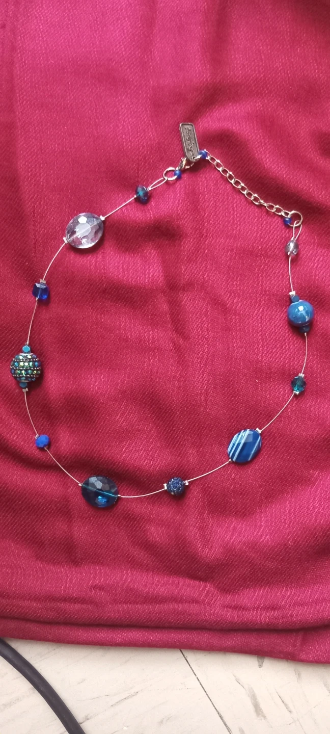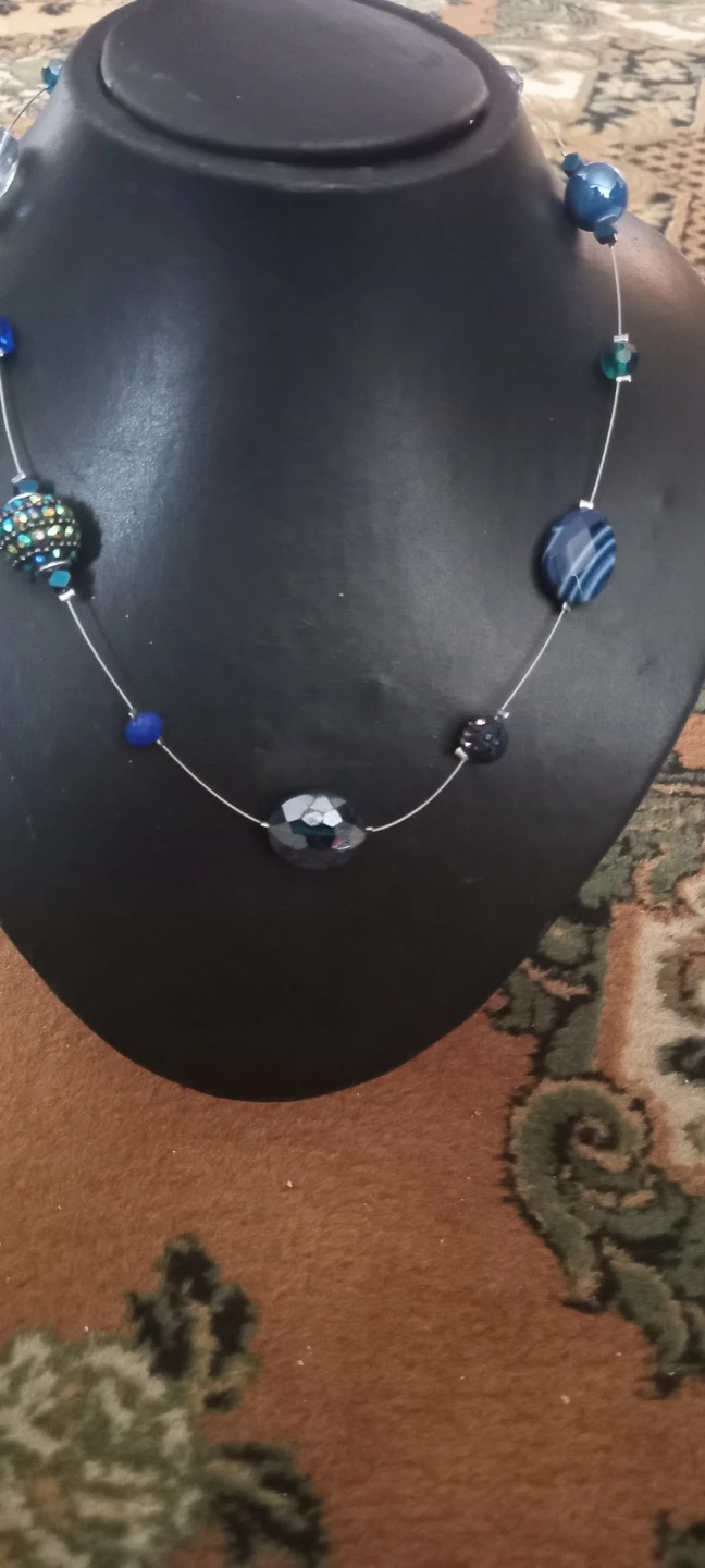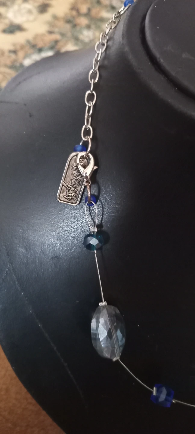 A pretty blue beaded necklace. It's made with a mix of glass and faceted beads in various shades of blue and clear. The chain is adjustable for a comfortable fit. Perfect for adding a pop of colour to any outfit!