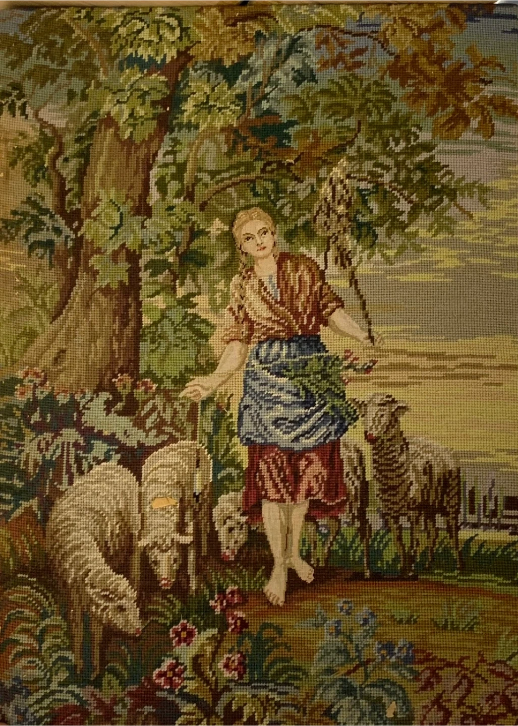 Beautiful vintage-style needlepoint tapestry featuring a pastoral scene with a shepherd, sheep, and lush countryside landscape. Rich colors and intricate stitching give this piece a classic, timeless look. Detailed needlepoint / tapestry design. Warm, traditional cottage or farmhouse décor. Perfect for vintage, cottagecore, or farmhouse-style interiors.