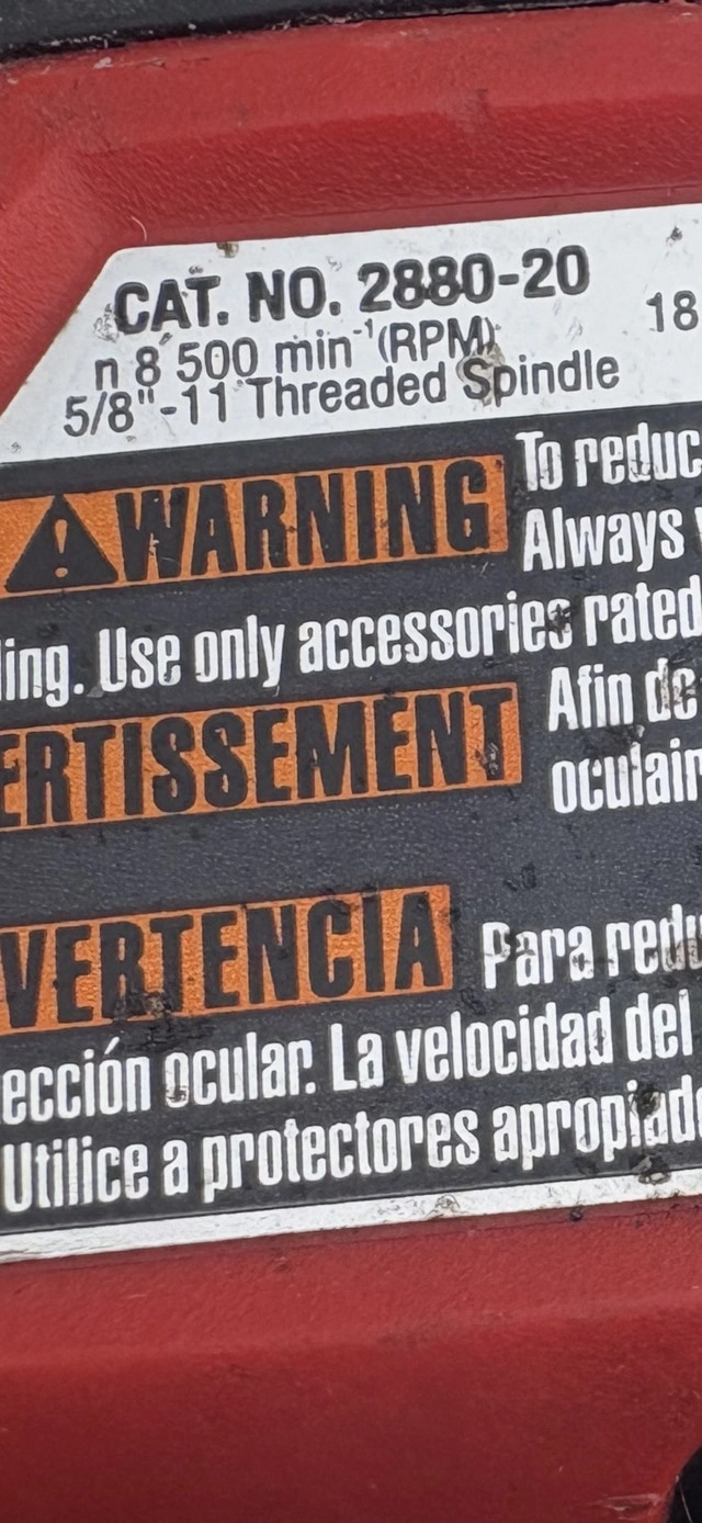 I'm selling a used Milwaukee cordless grinder. It's a robust tool with a 5/8"-11 threaded spindle and a maximum speed of 8,500 RPM, perfect for various grinding and cutting tasks. This grinder has seen some action but is still in good working condition and ready for its next project. Being cordless, it offers great flexibility and ease of use around the job site.