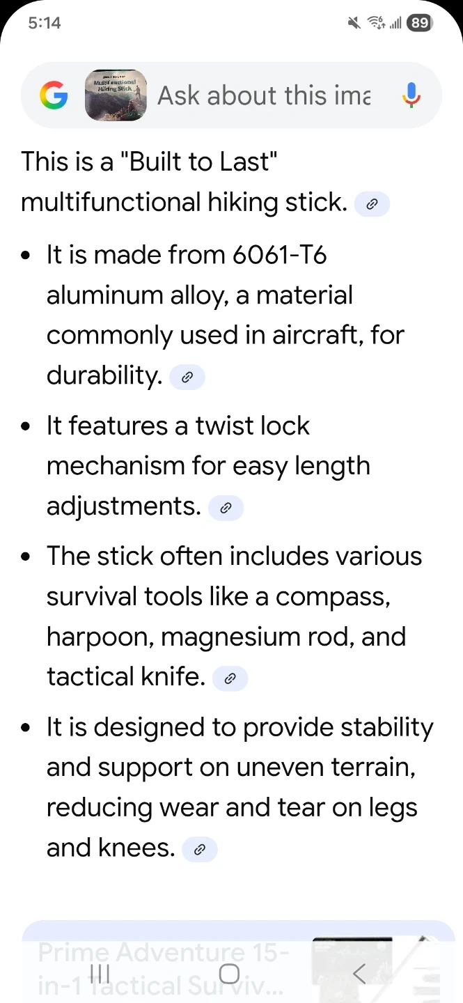 This is a multifunctional hiking stick. It's made from 6061-T6 aluminum alloy with a twist-lock mechanism. Includes a compass, harpoon, magnesium rod, and tactical knife.