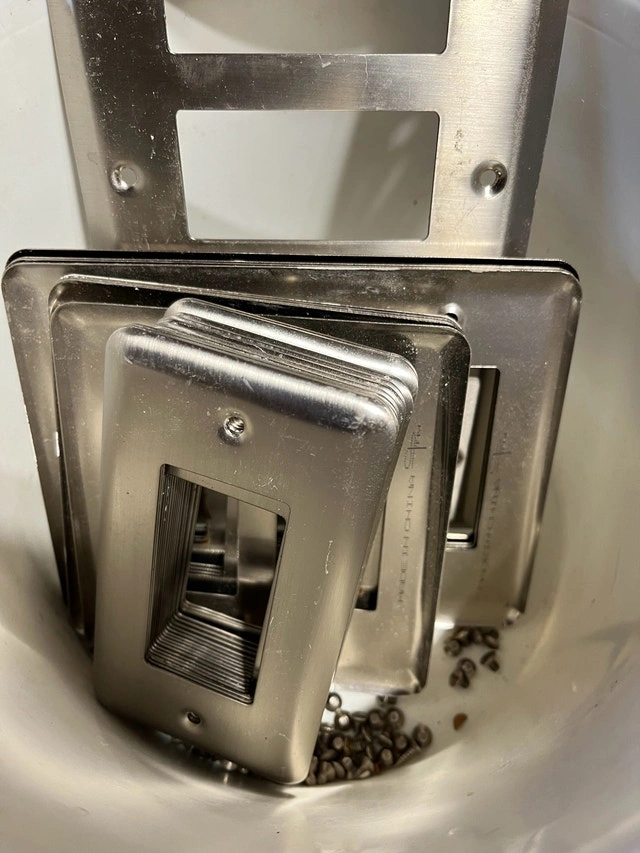 Stainless steel cover plates for plugs/switches with screws. 20 single, 5 double, 4 triple, 1 four-gang. In good shape, just need a wipe.