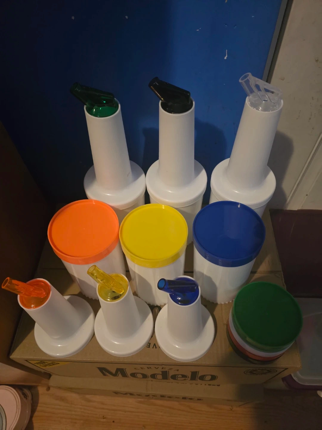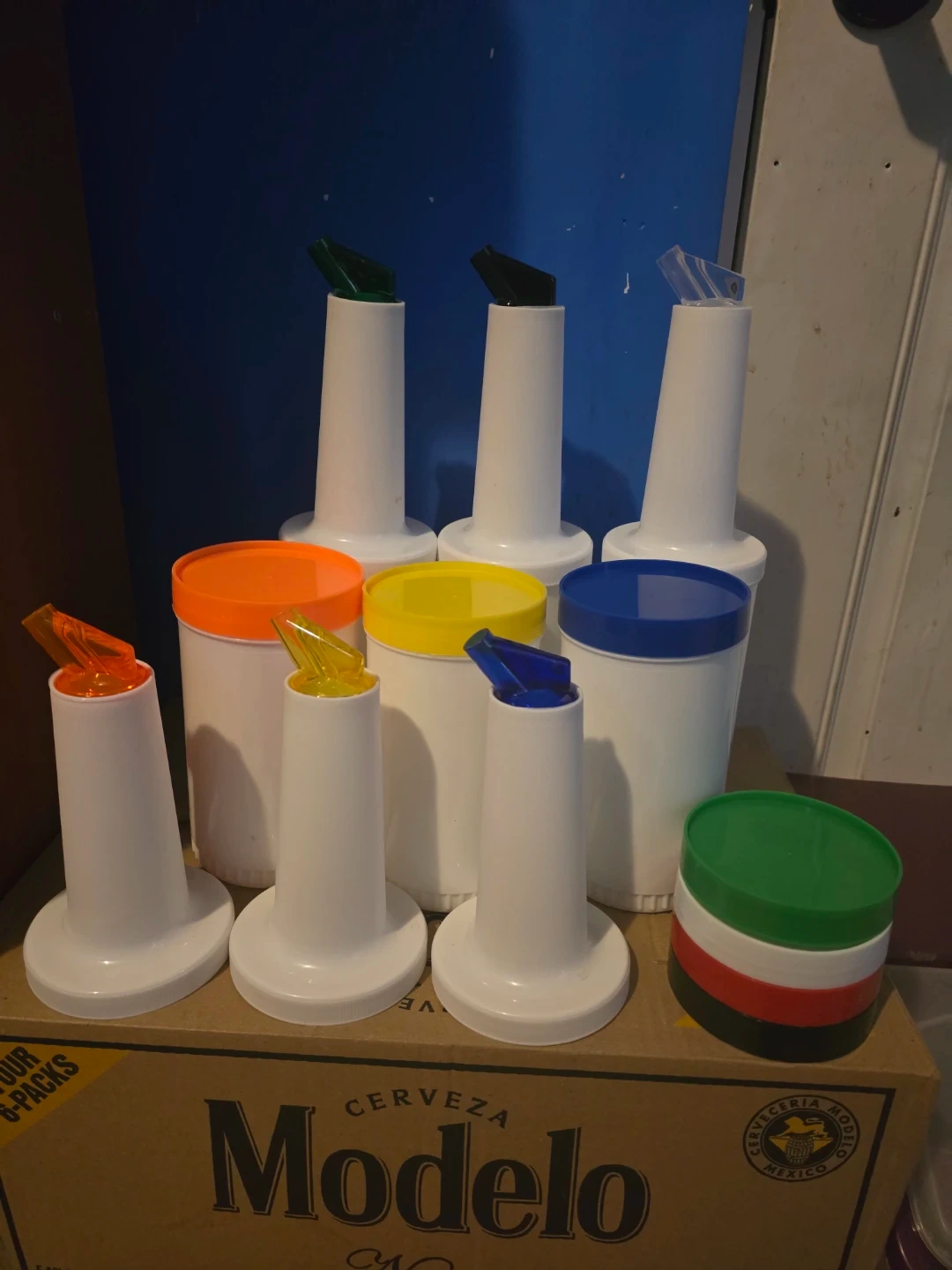 se habla español. Set of seven white bar speed pourers with different colored caps and spouts. Includes green, black, clear, orange, yellow, blue, and a multicolor cap. These are great for bars or home use for quick and easy pouring. Made of plastic.