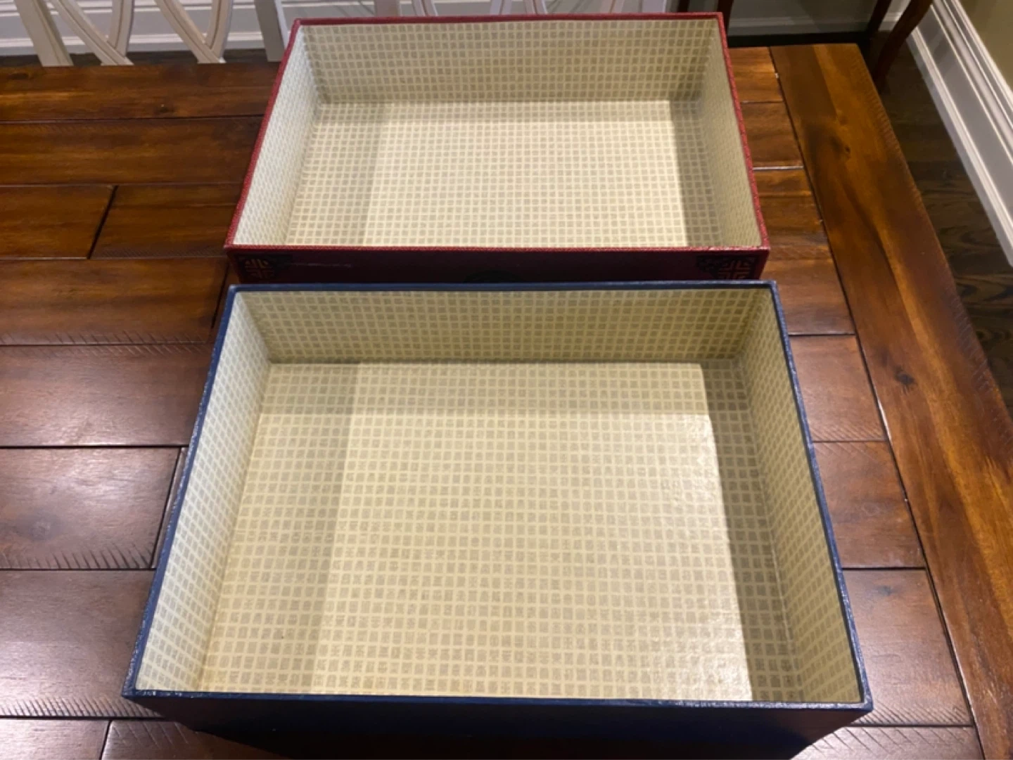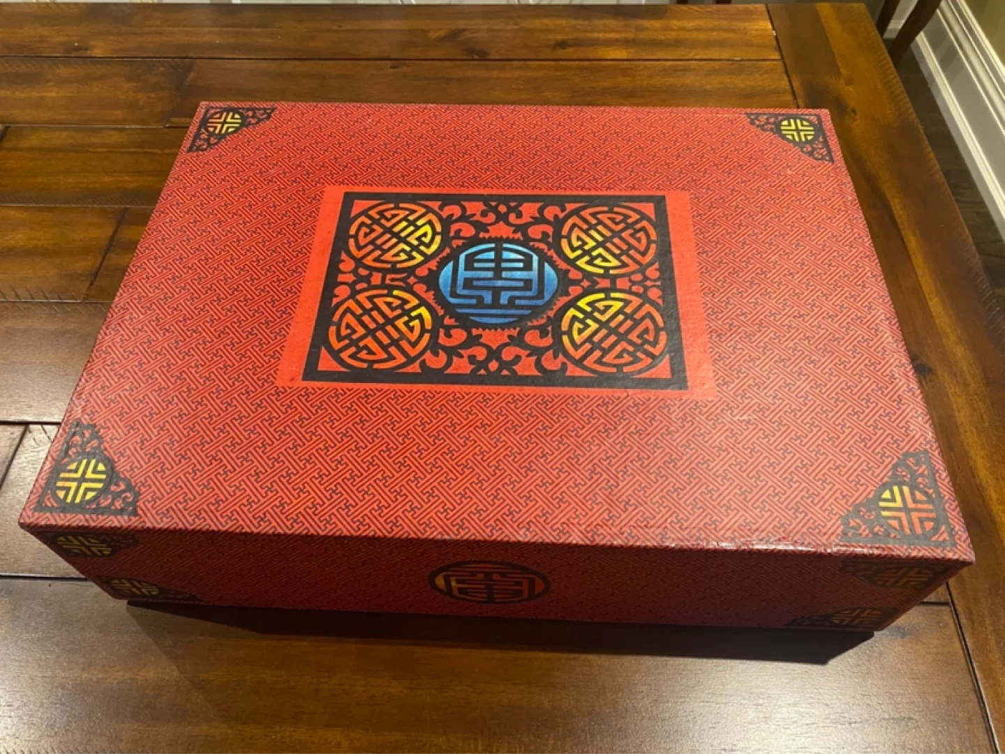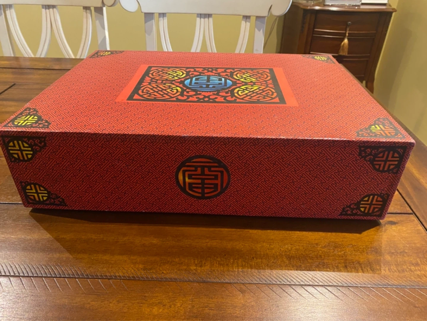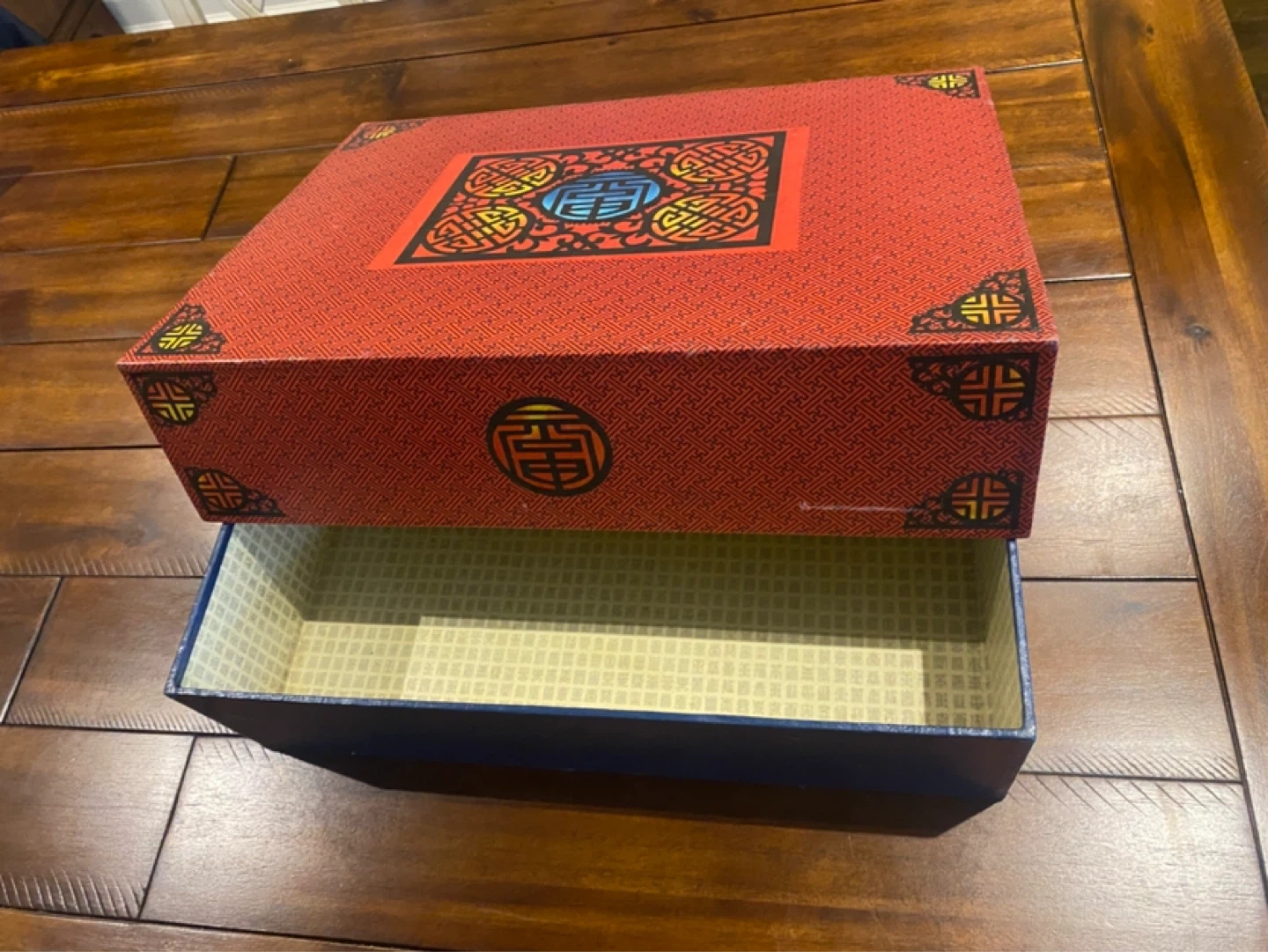 A lovely decorative red storage box with intricate patterns and a sliding drawer. It's made of sturdy cardboard and lined with a textured pattern. Perfect for keeping small treasures organized or as a gift box!