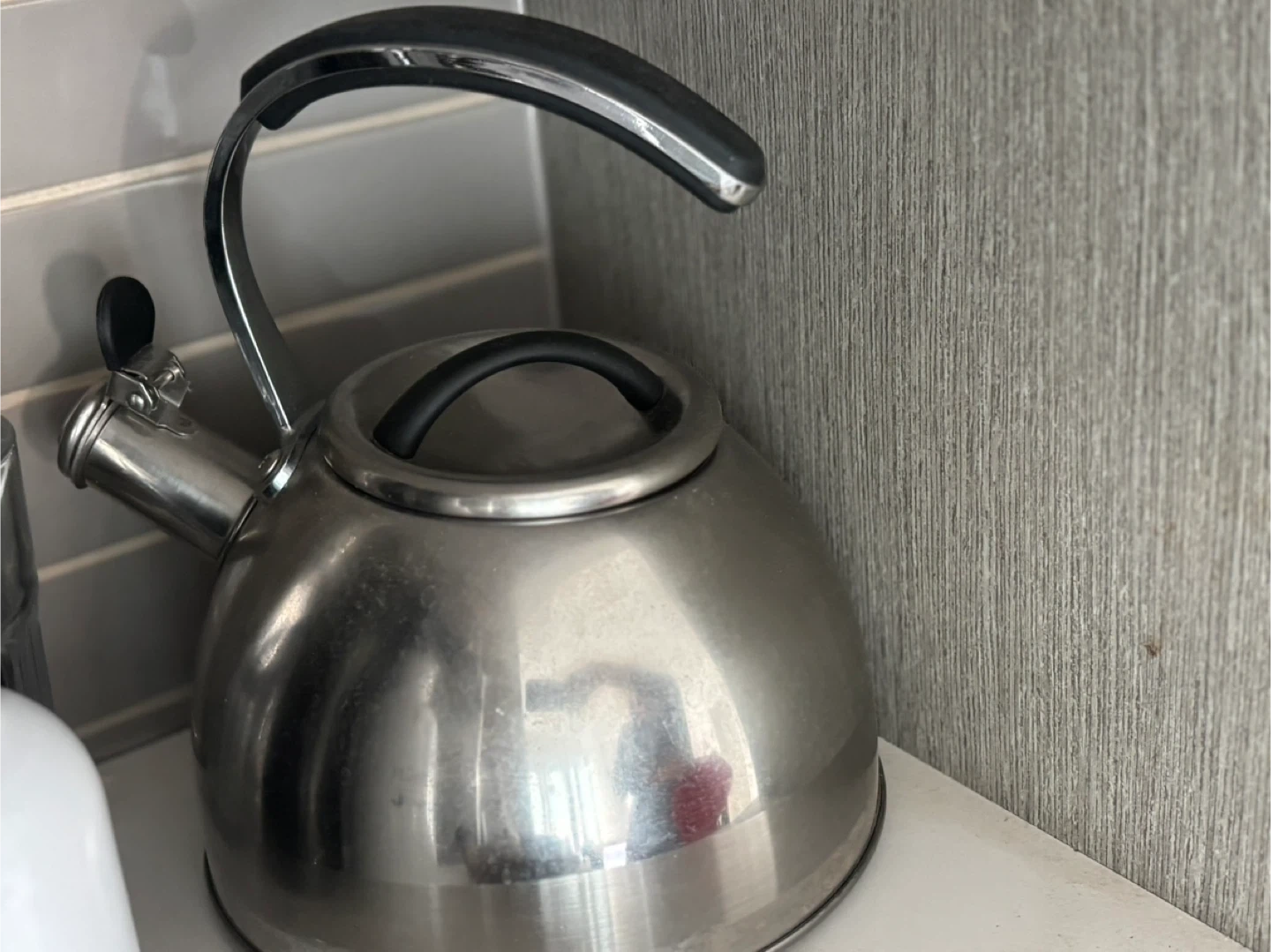 A classic whistling kettle made of stainless steel. It has a comfortable handle and a spout that whistles when the water boils. Perfect for making tea or coffee quickly!
