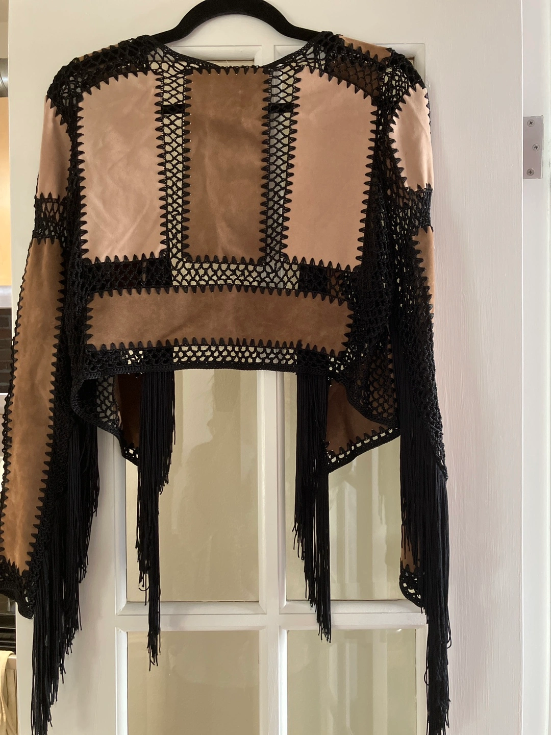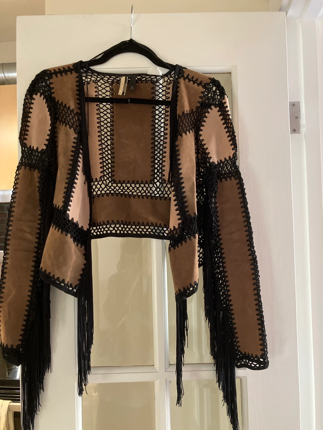 This cropped jacket features a combination of tan suede panels and black crochet detailing. It has long sleeves and a fringe trim along the hem and cuffs. It's a unique statement piece for any wardrobe!