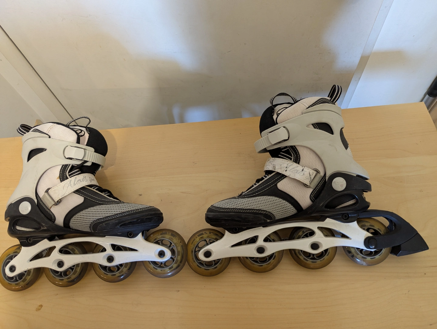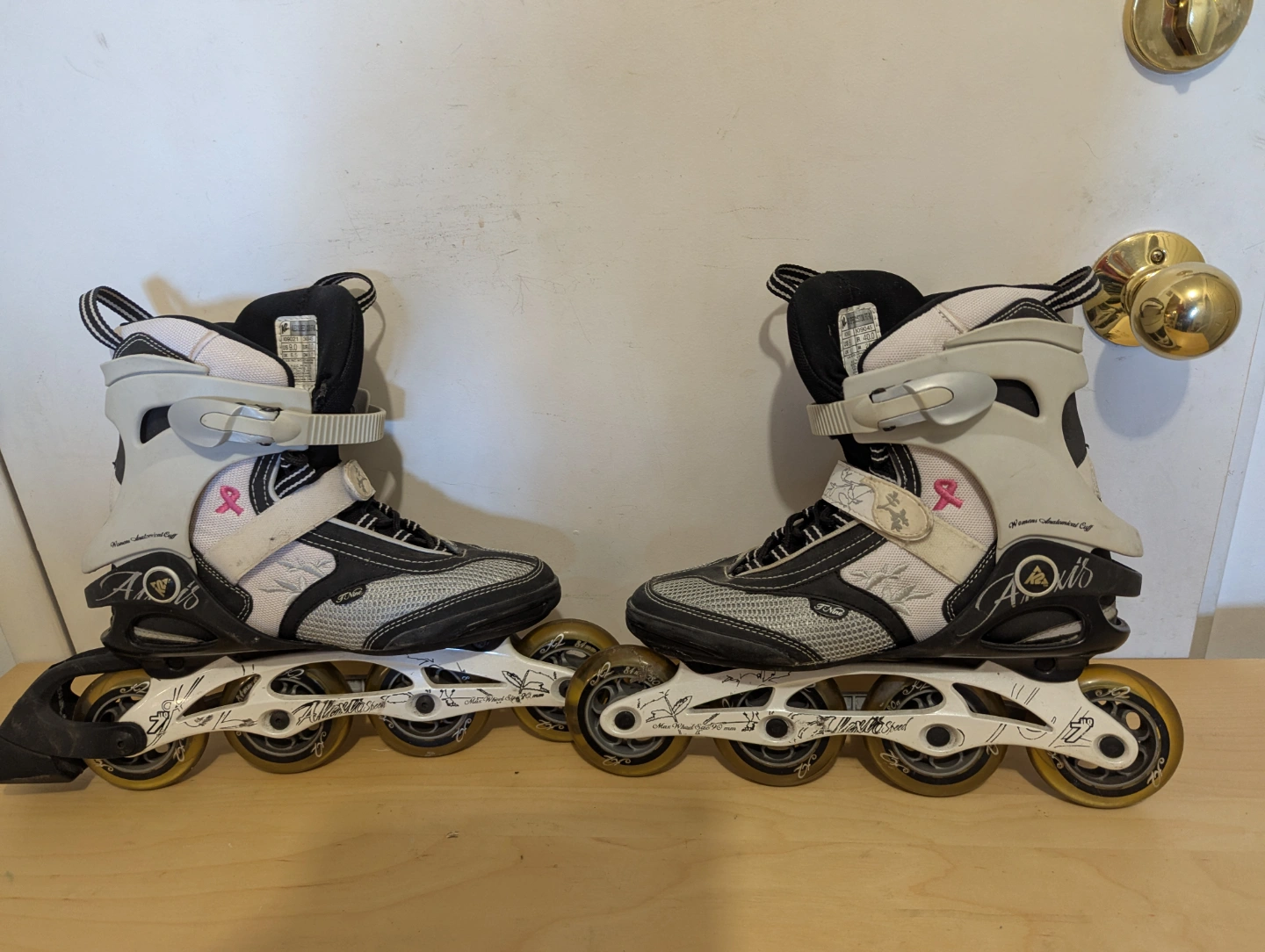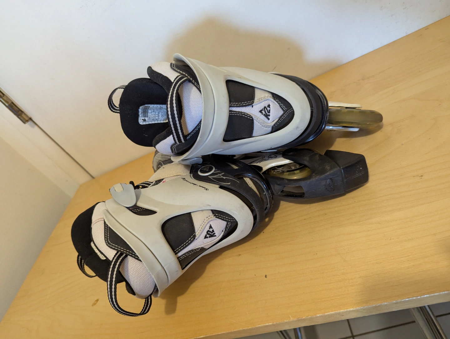Used K2 inline skates. Grey, black, and white colour scheme. Women's size 7. Four wheels per skate. Some wear and tear.