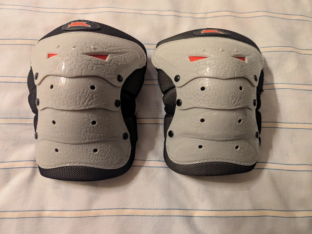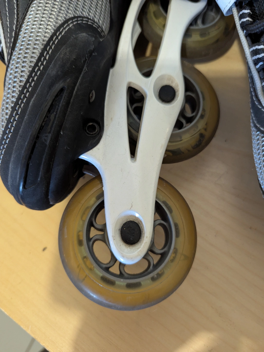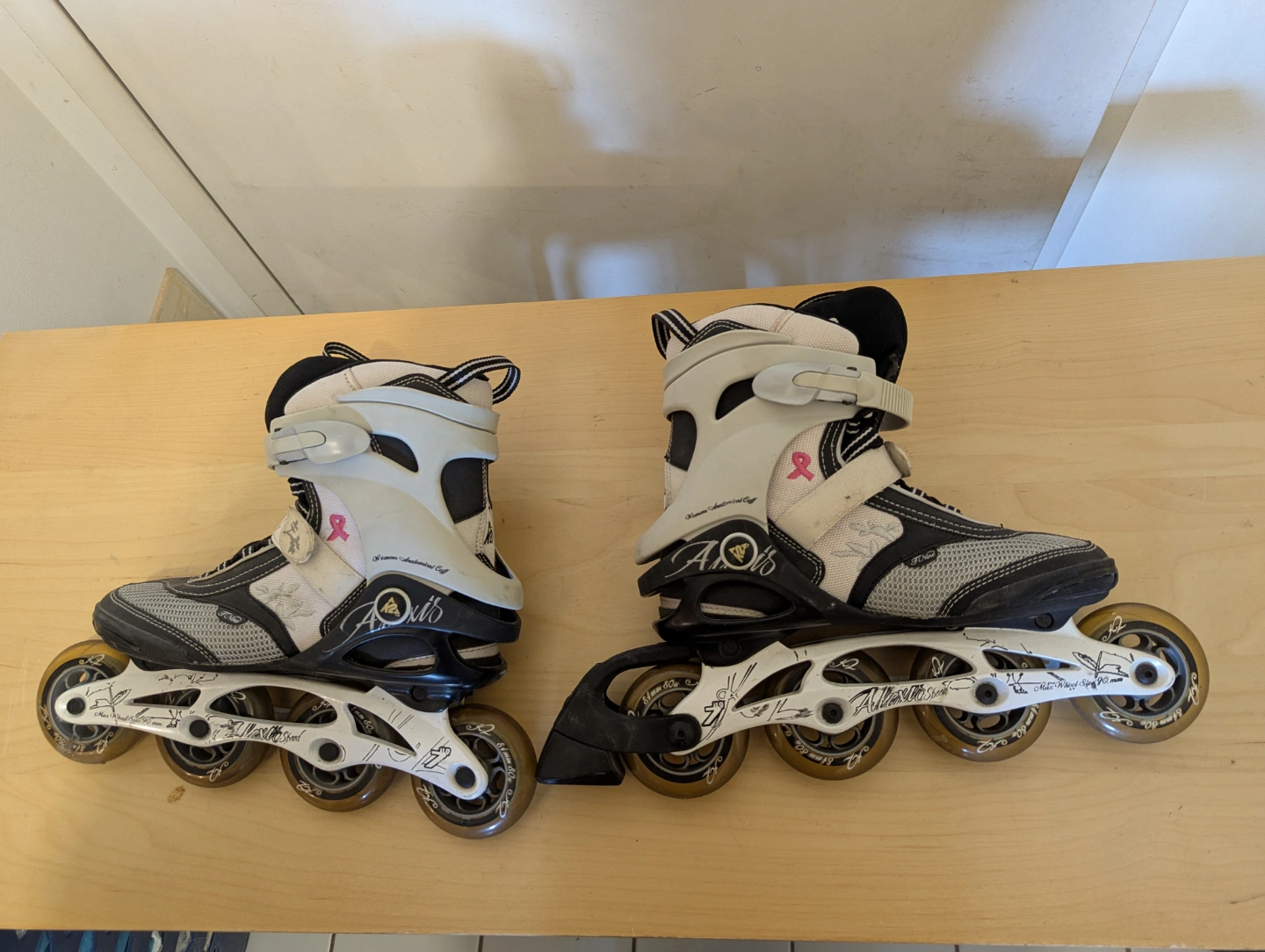 Used K2 inline skates. Grey, black, and white colour scheme. Women's size 7. Four wheels per skate. Some wear and tear.