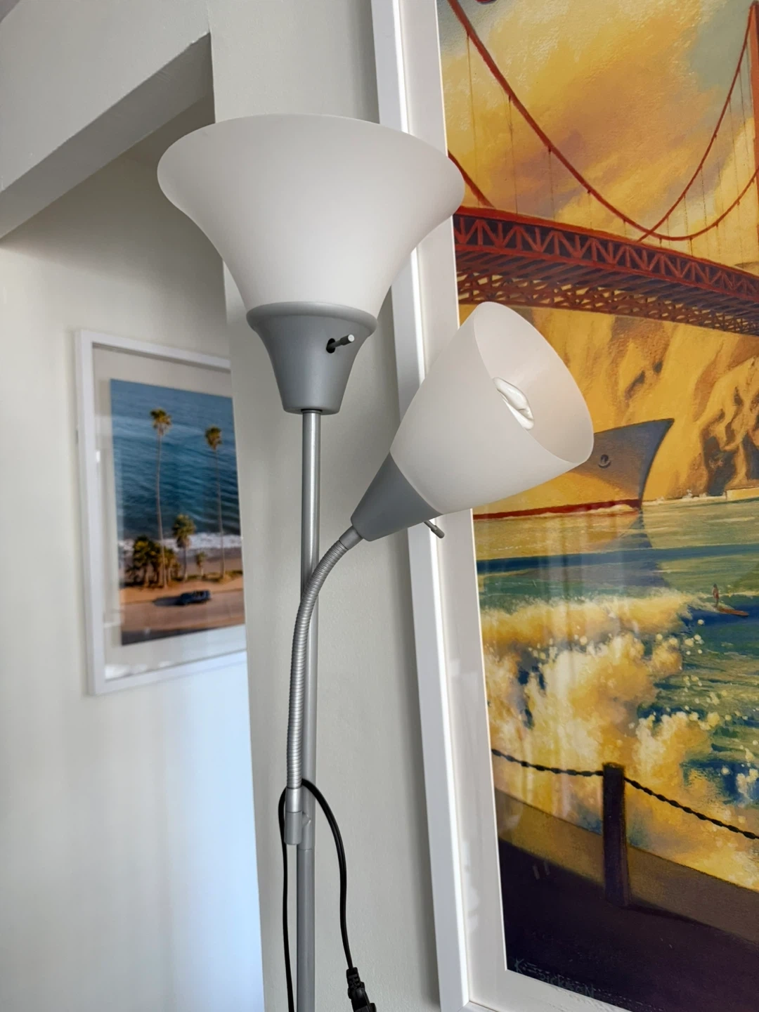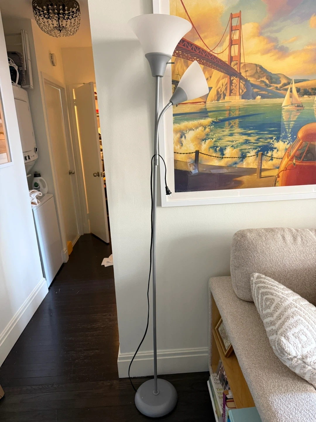 60This floor lamp features a main upward-facing light and an adjustable reading light, perfect for any room! It stands tall and provides ample lighting for reading, working, or simply adding ambiance to your space.