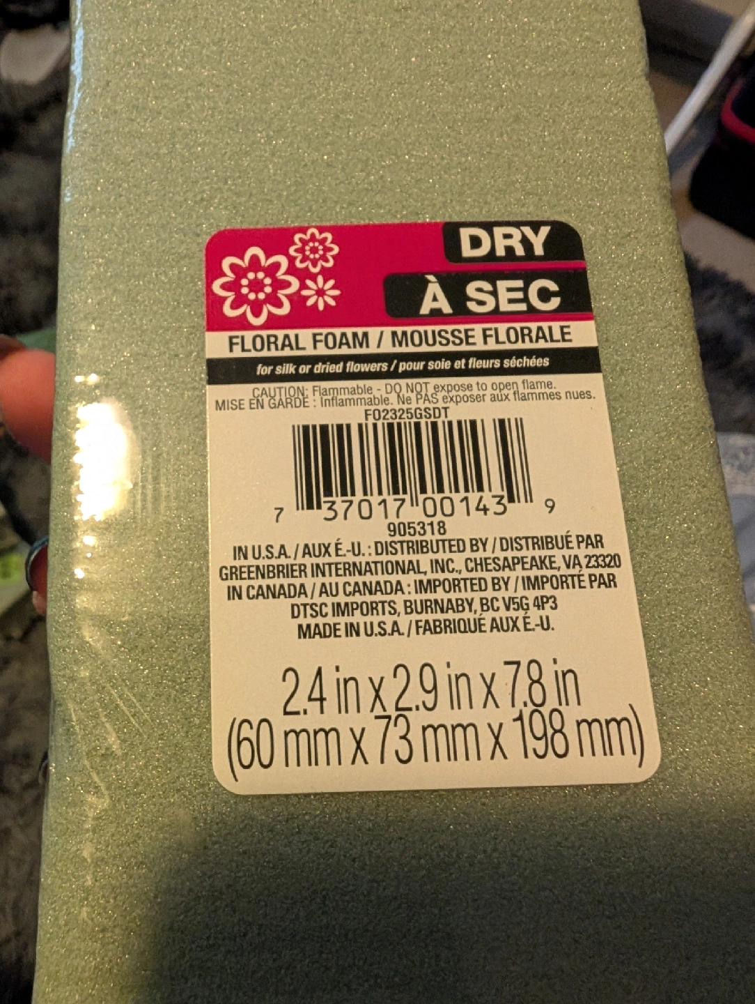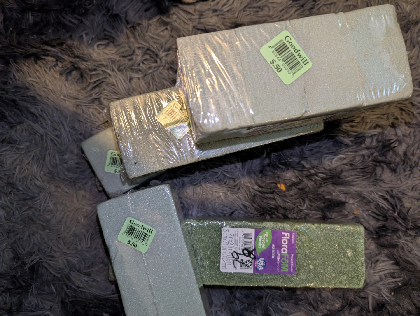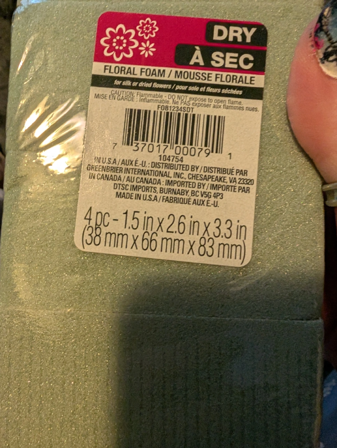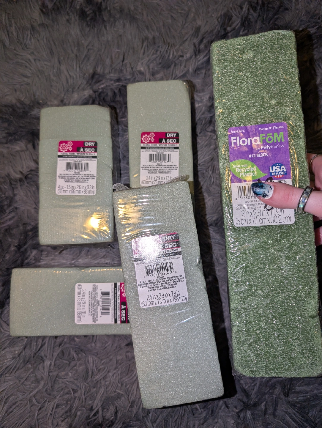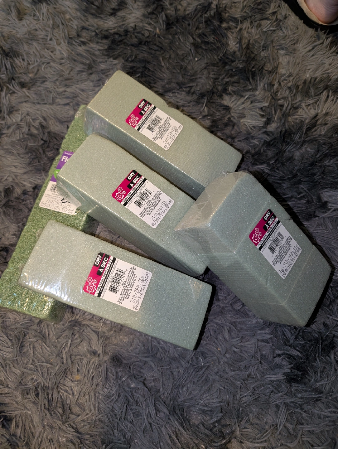 Bundle of 5 new sealed packages dry floral arranging foam. There are two brands: Dry A Sec and FloraFom. The Dry A Sec blocks are: - 4 pc - 1.5 in x 2.6 in x 3.3 in (38 mm x 66 mm x 83 mm) - 2.4 in x 2.9 in x 7.8 in (60 mm x 73 mm x 198 mm) The FloraFom block is: - 2 in x 2.8 in x 11.9 in (5 cm x 7.1 cm x 30.2 cm) These are perfect for silk or dried flower arrangements! From home with dogs. North Center (Chicago) near Damen & Montrose