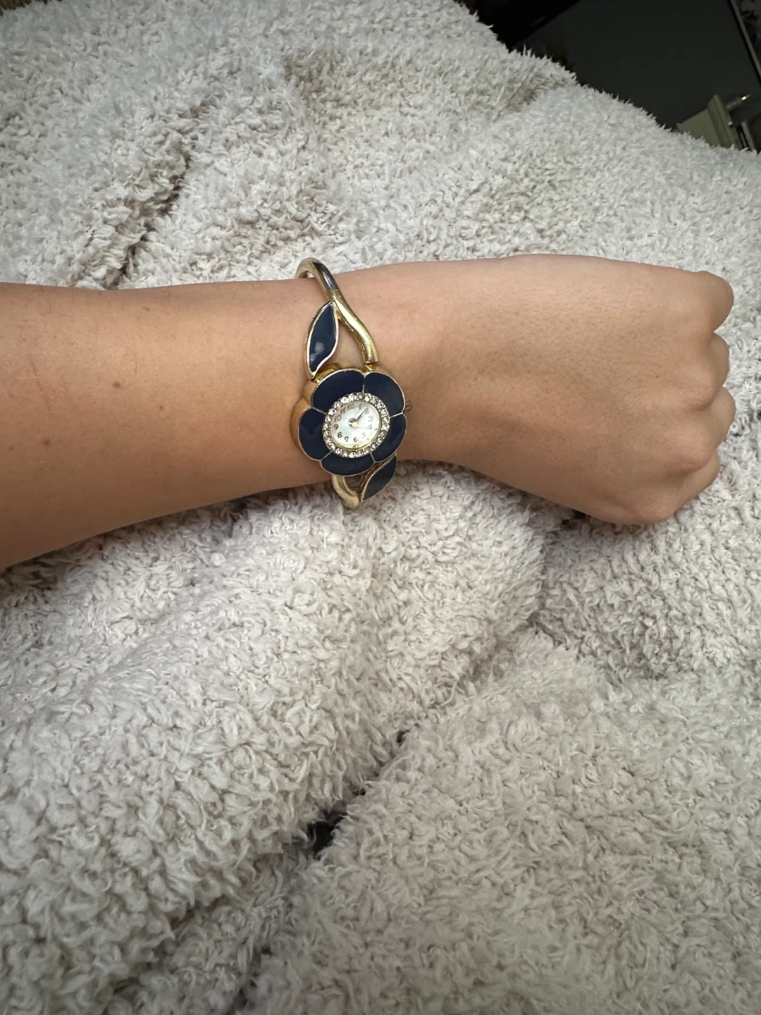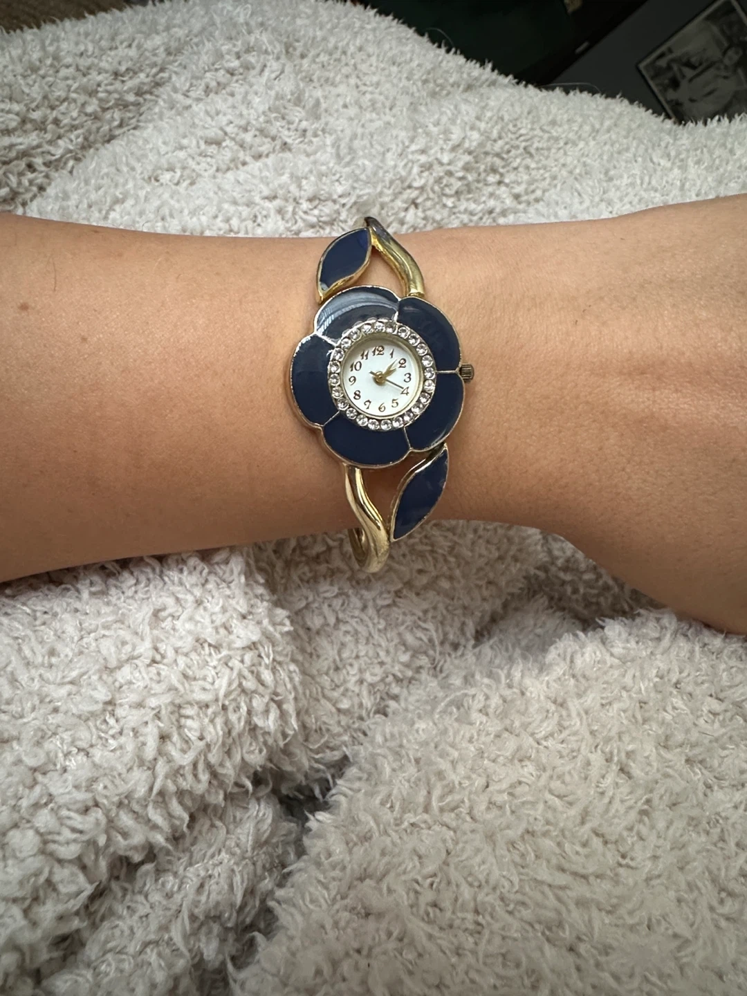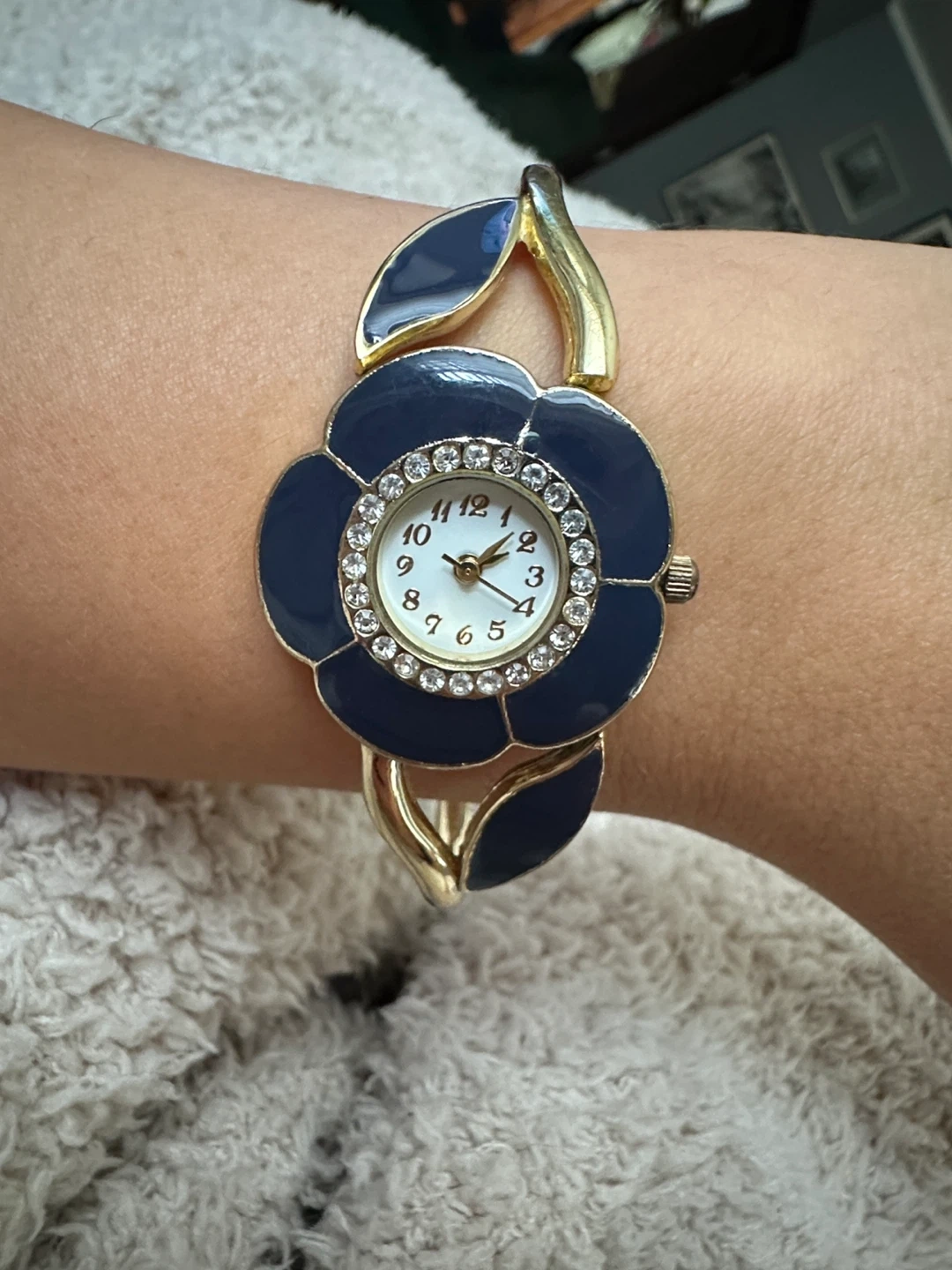 Cute flower design bangle watch with a blue and gold finish. The face has a ring of rhinestones around it, making it a pretty statement piece!