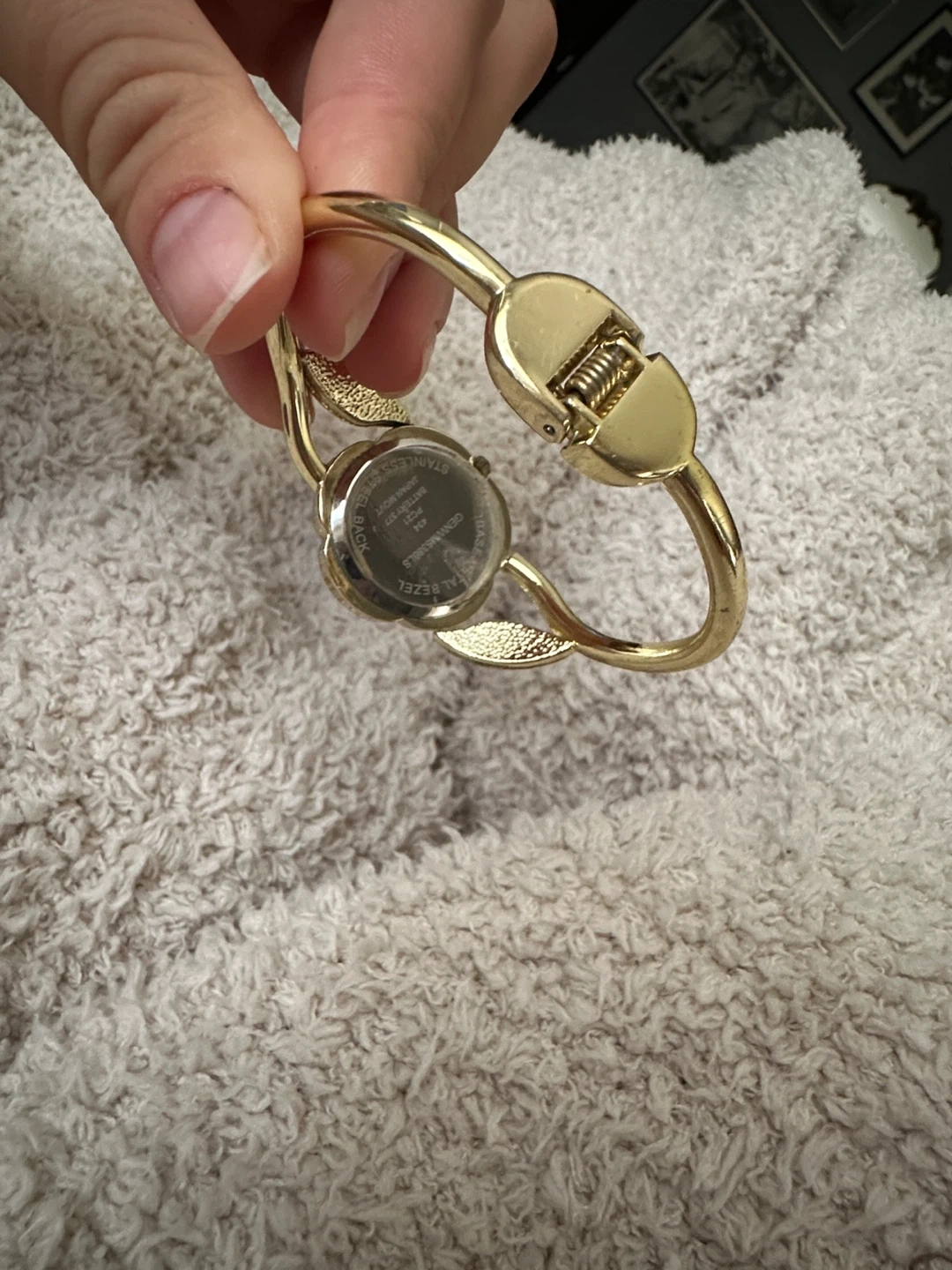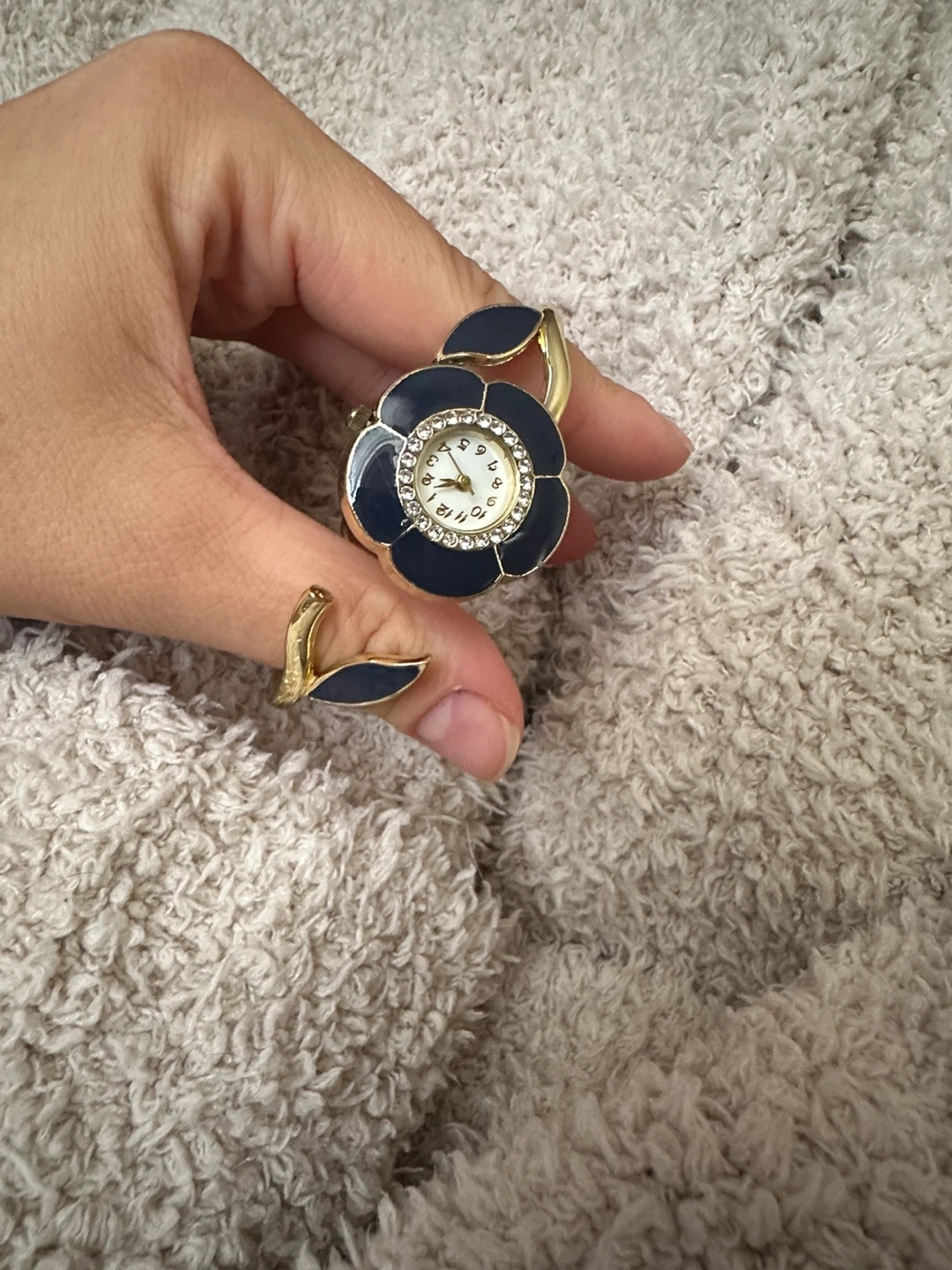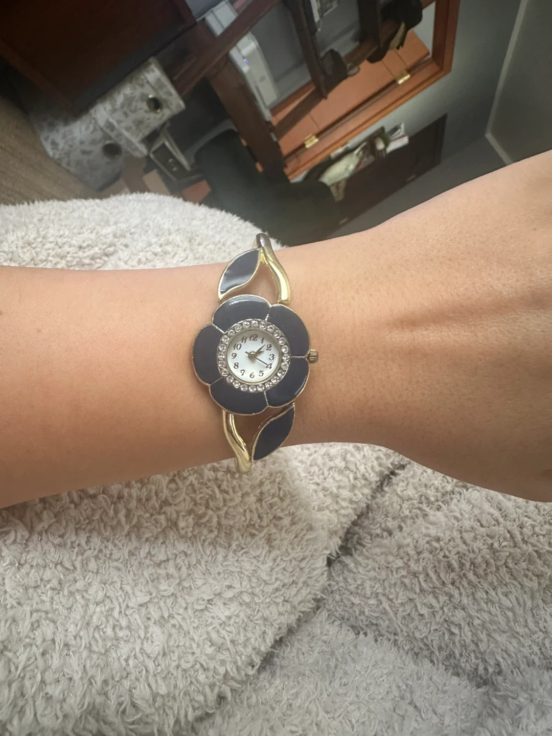 Cute flower design bangle watch with a blue and gold finish. The face has a ring of rhinestones around it, making it a pretty statement piece!
