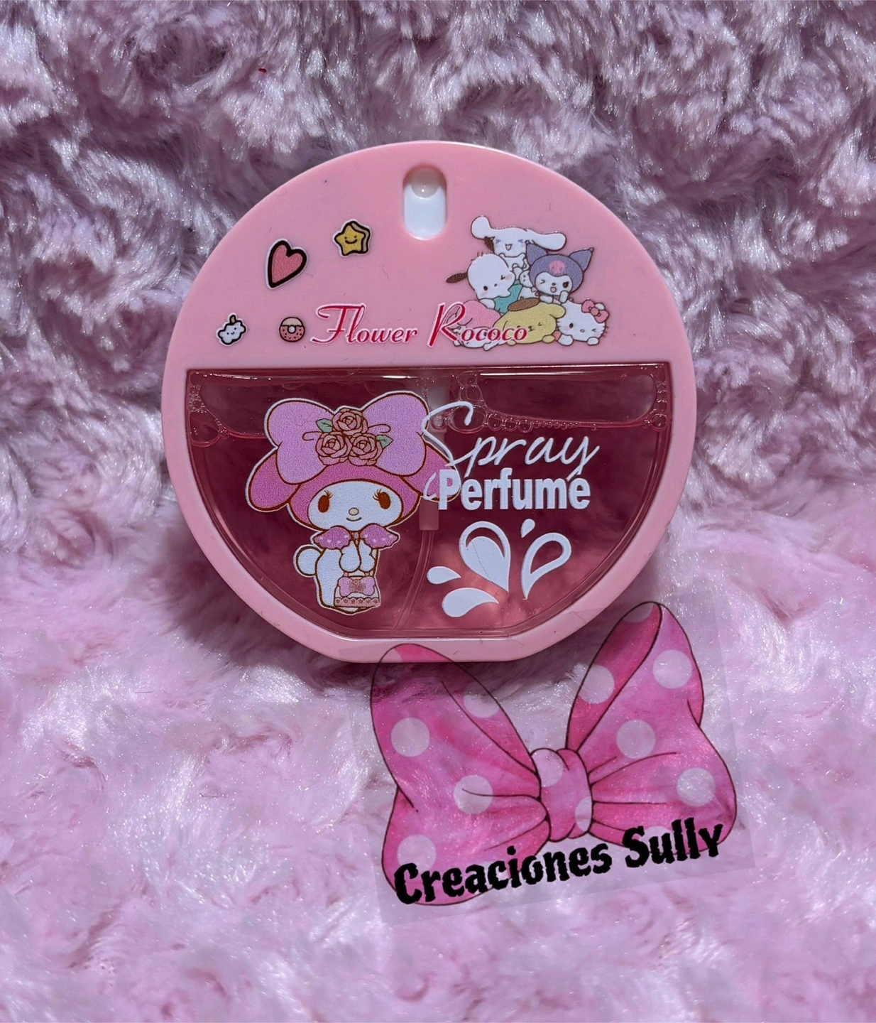 A pink perfume spray. Features some characters, including My Melody. It is a great way to feel refreshed throughout the day.